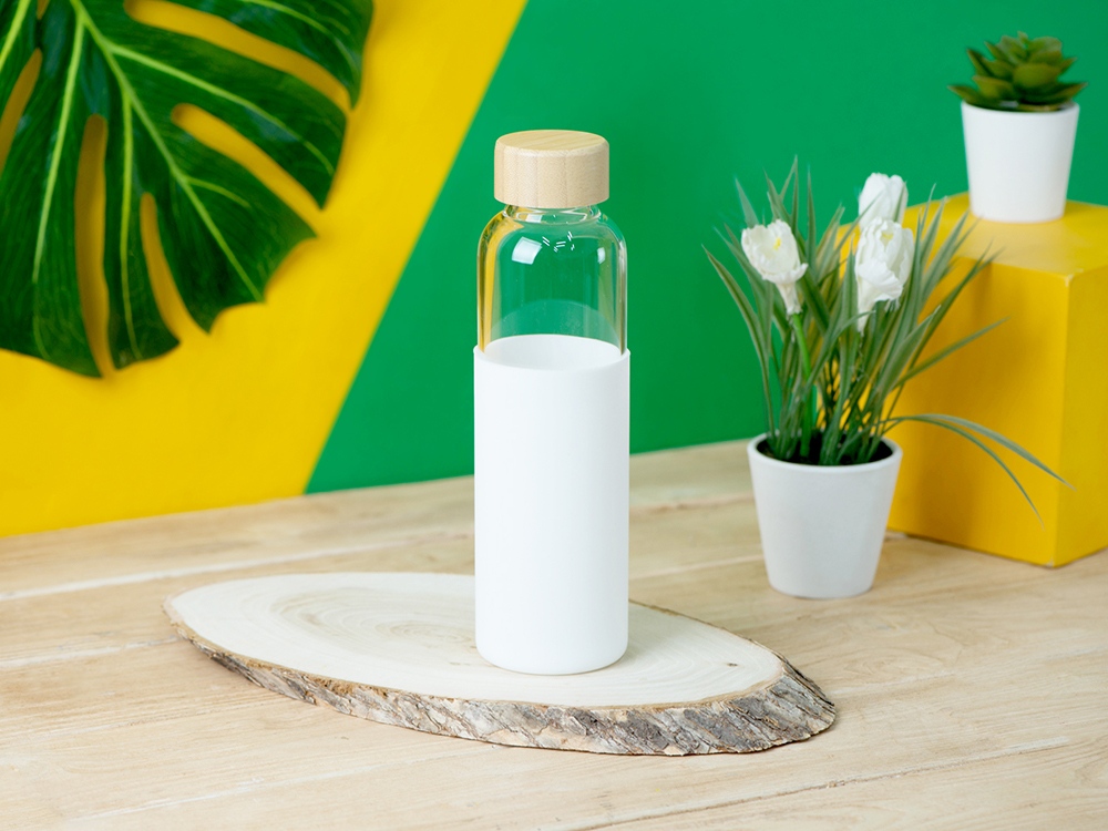 Стильная бутылка для воды сразу привлечет внимание к себе, где бы Вы ее ни достали, так как представляет собой идеальную композицию из трех экологичных материалов. Бутылка выполнена из качественного боросиликатного стекла, поэтому абсолютно не влияет на вкус и запах напитков. Силиконовый чехол поможет защитить бутылку от повреждений и легких падений, также чехол выполняет анти-скользящую функцию. Крышка выполнена из натурального бамбука. Не замораживайте и не используйте бутылку в микроволновке. Бутылка легко моется. Объем 550мл. -