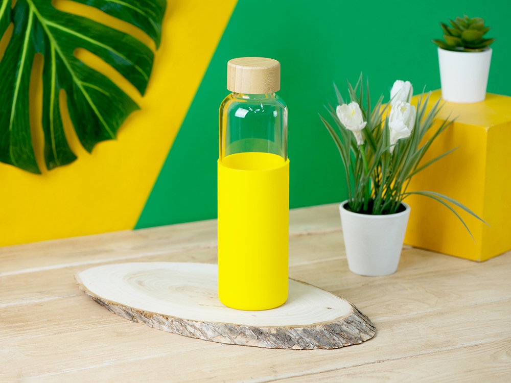 Стильная бутылка для воды сразу привлечет внимание к себе, где бы Вы ее ни достали, так как представляет собой идеальную композицию из трех экологичных материалов. Бутылка выполнена из качественного боросиликатного стекла, поэтому абсолютно не влияет на вкус и запах напитков. Силиконовый чехол поможет защитить бутылку от повреждений и легких падений, также чехол выполняет анти-скользящую функцию. Крышка выполнена из натурального бамбука. Не замораживайте и не используйте бутылку в микроволновке. Бутылка легко моется. Объем 550мл. -