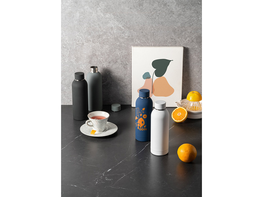 Термобутылка из нержавеющей стали с soft-touch покрытием, двойной корпус с вакуумной изоляцией и вместимостью до 550 мл.