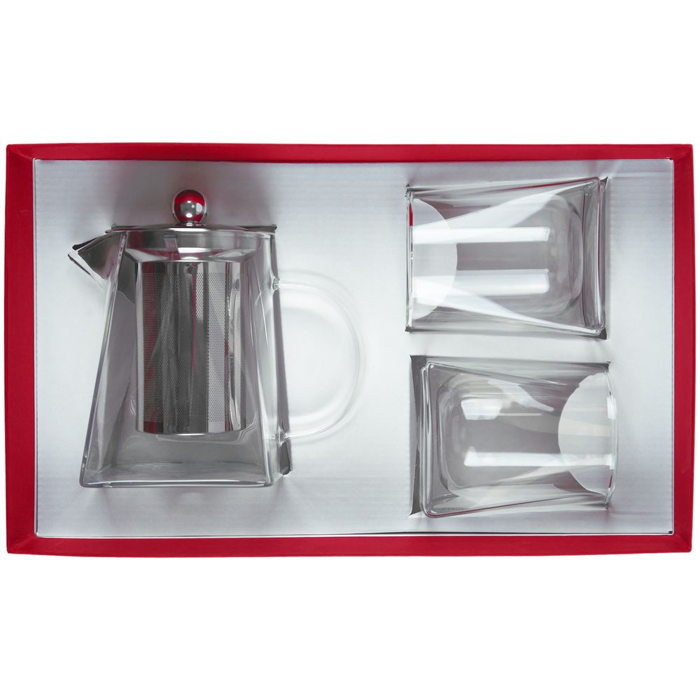 чайник, стаканы - боросиликатное стекло; крышка и сито - нержавеющая сталь; коробка - переплетный картон, бумага Classy Covers
