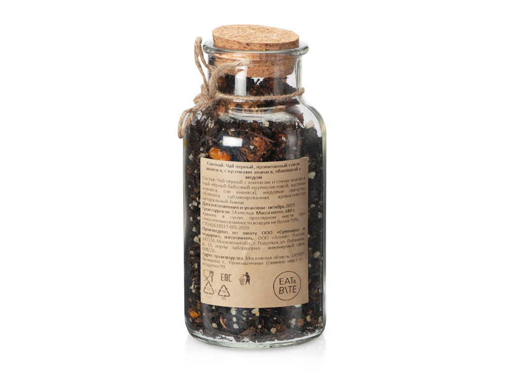 Состав: чай чёрный с ананасом и соком ананаса (чай чёрный байховый крупнолистовой, кусочки ананаса, сок ананаса), медовые гранулы, облепиха сублимированная, ароматизатор натуральный Ананас.