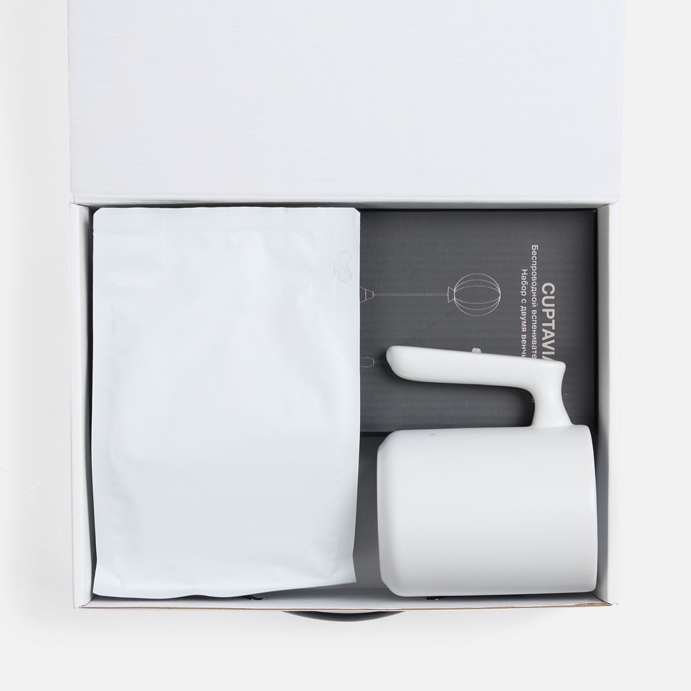 вспениватель: 11х4,7х23,3 см; кружка: диаметр 8 см, ширина с ручкой 11,2 см, высота 10,2 см; пачка кофе: 13х4,5х18,5 см; коробка: 26,3x36,6x10 см