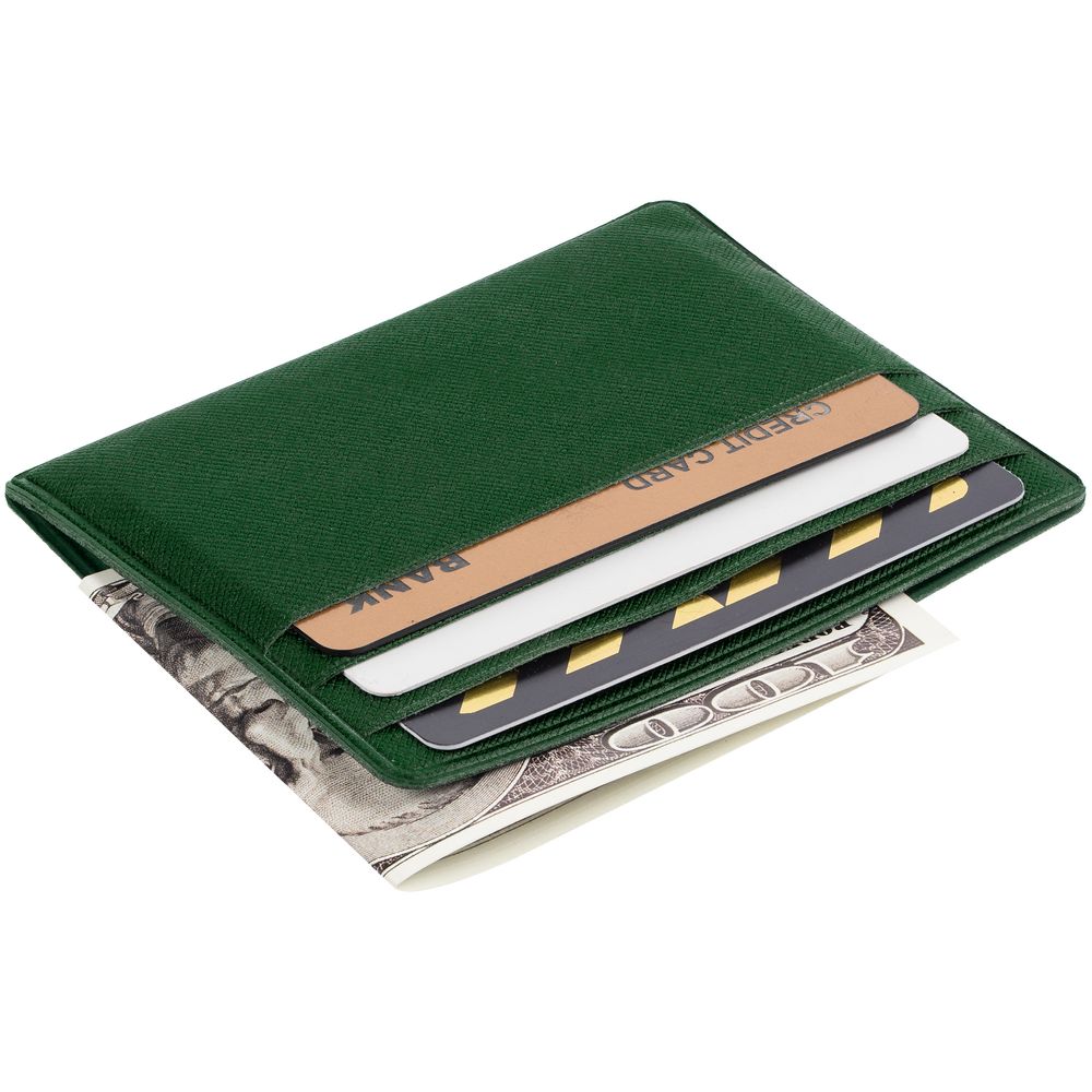 Чехол для карточек из искусственного материала, имитирующего сафьяновую кожу, с шестью отделениями для кредитных карт и одним — для сложенных купюр. -