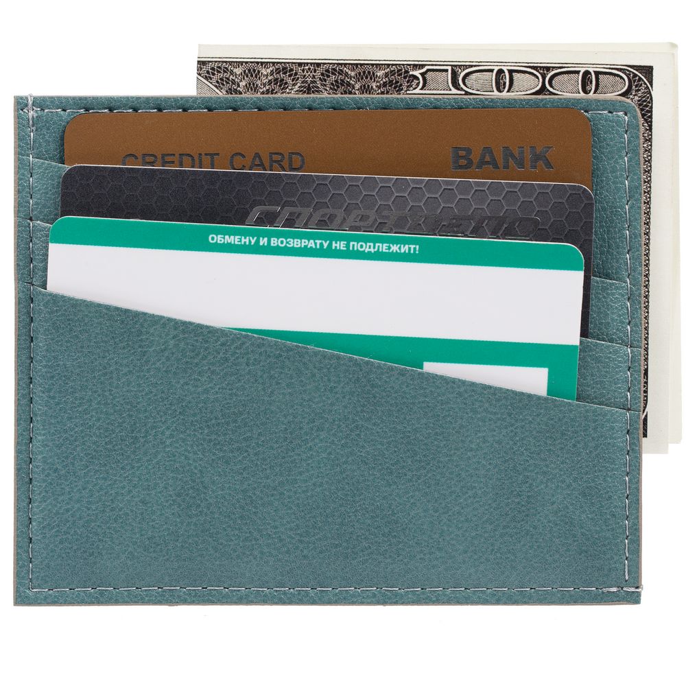 Чехол выполнен из материала Petrus, голубой JJ, дополнен окрашенным срезом края и внутренним карманом из серого картона. Имеет 4 отделения для кредитных карт и 1 отделение для купюр. -