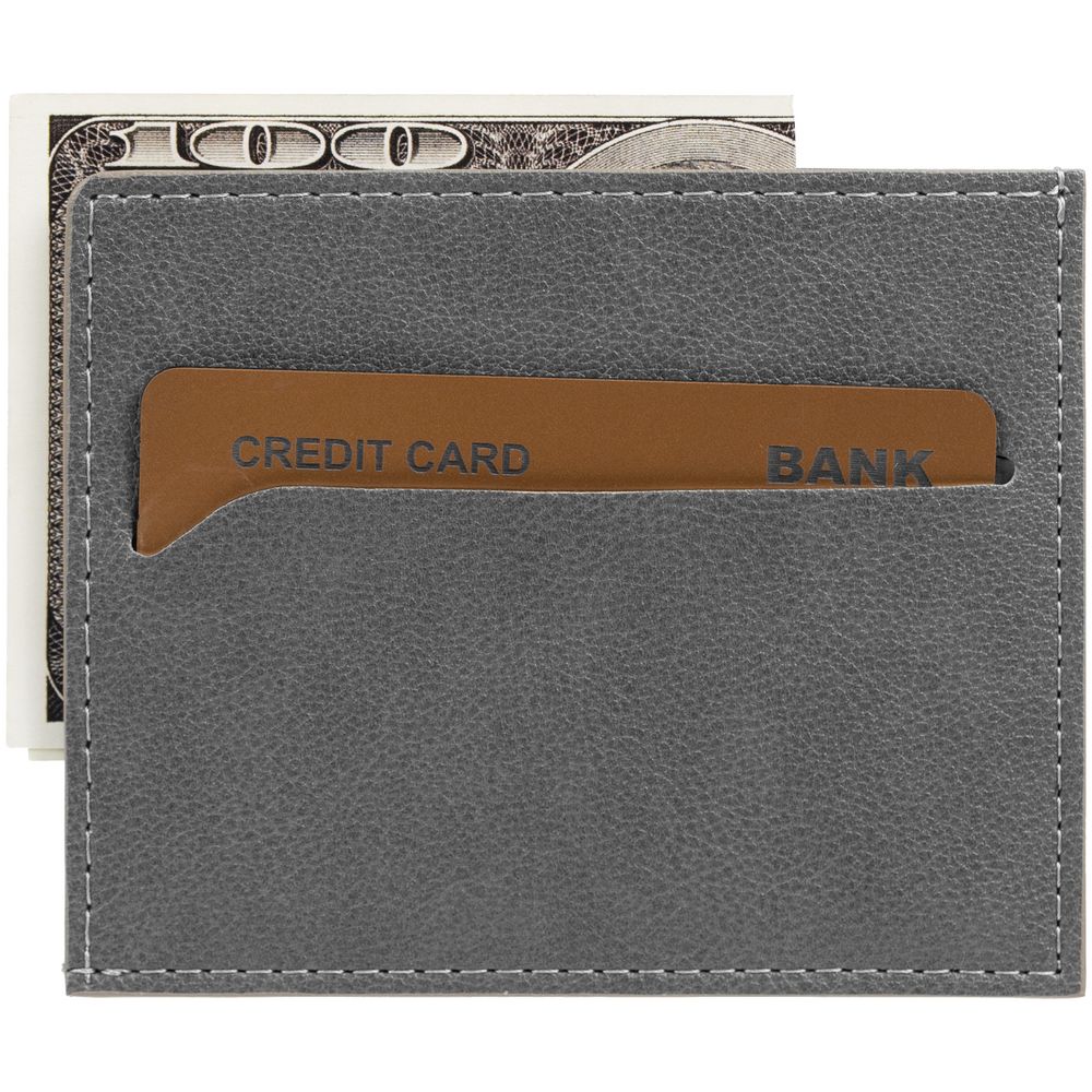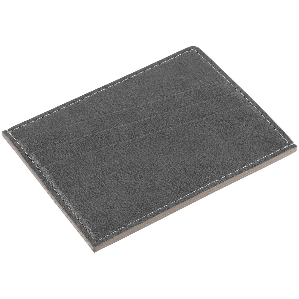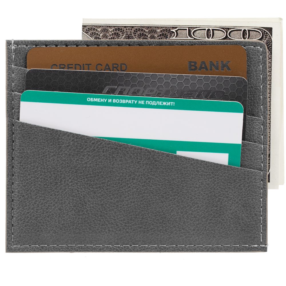 Чехол выполнен из материала Petrus, серый СС, дополнен окрашенным срезом края и внутренним карманом из серого картона. Имеет 4 отделения для кредитных карт и 1 отделение для купюр. -