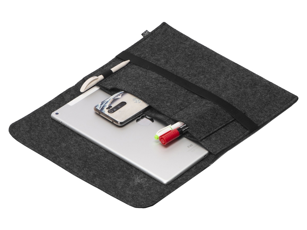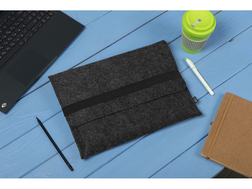 Чехол для ноутбука выполнен из фетра толщиной 3 мм. С передней стороны расположен органайзер размером 13x27 см для канцелярских принадлежностей, карт и телефона. Чехол фиксируется в закрытом виде с помощью эластичной ленты. -