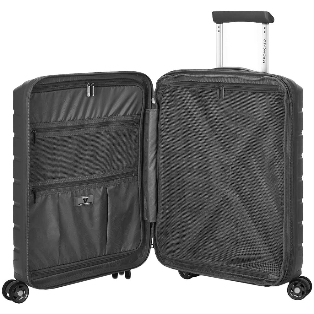 - Чемодан с 2 отделениями: одно отделение с сетчатым разделителем и прижимными ремнями, а второе оснащено перегородкой на молнии с двумя карманами