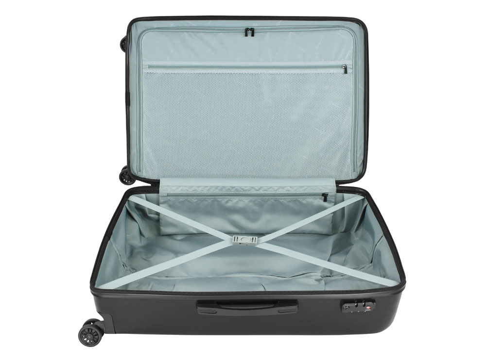 Внешняя организация: телескопическая ручка, кодовый замок TSA, 4 двойных колеса, боковая ручка, ручка на дне