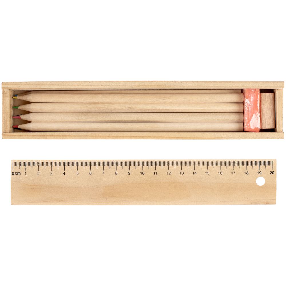 Набор из восьми цветных карандашей, точилки и ластика в деревянном пенале с крышкой-линейкой. -