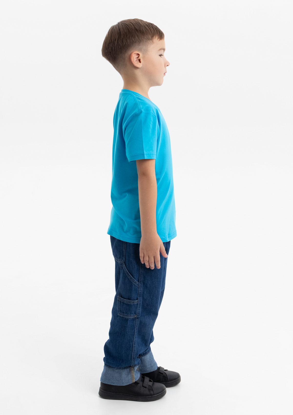 Детская футболка свободного силуэта с округлым воротом и втачным рукавом. Плечевые швы и шов горловины спинки усилены настрочной бейкой из основного полотна.
