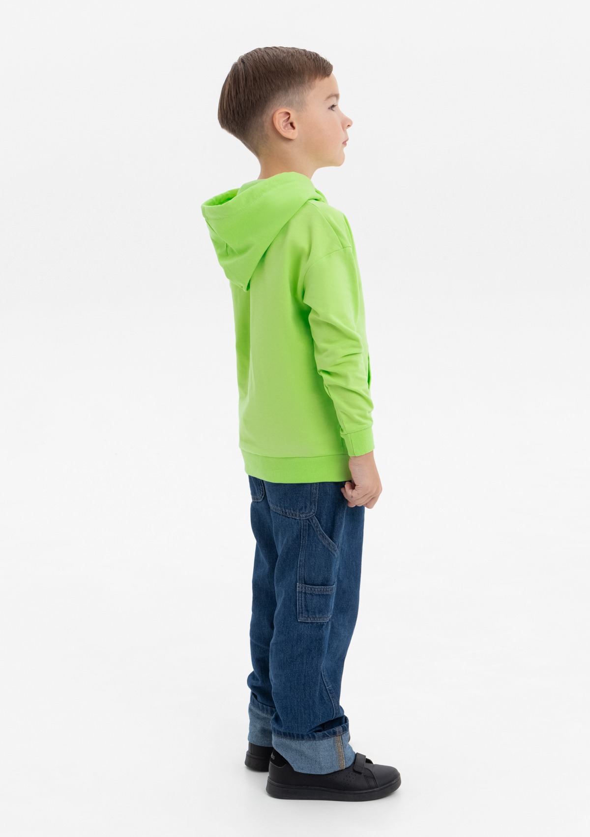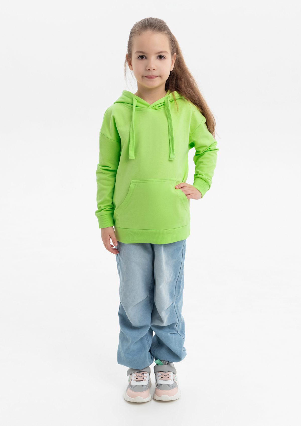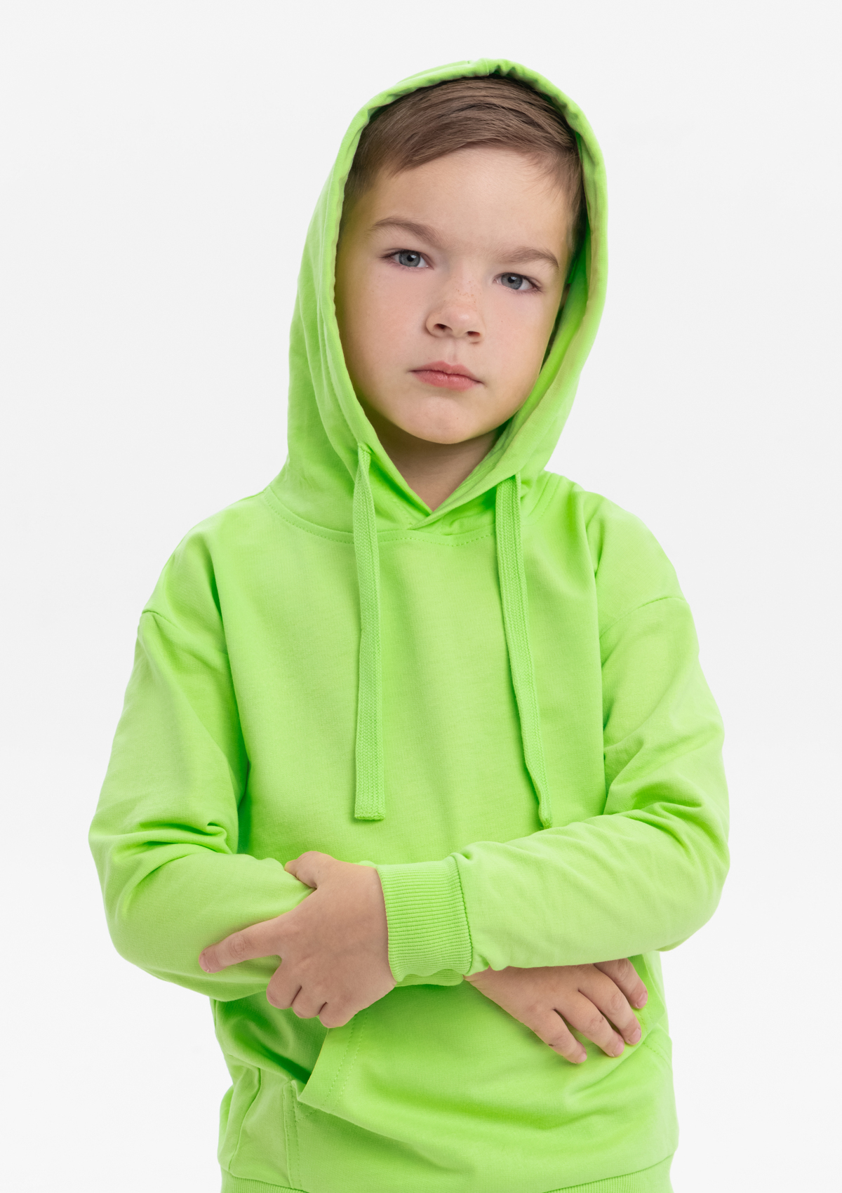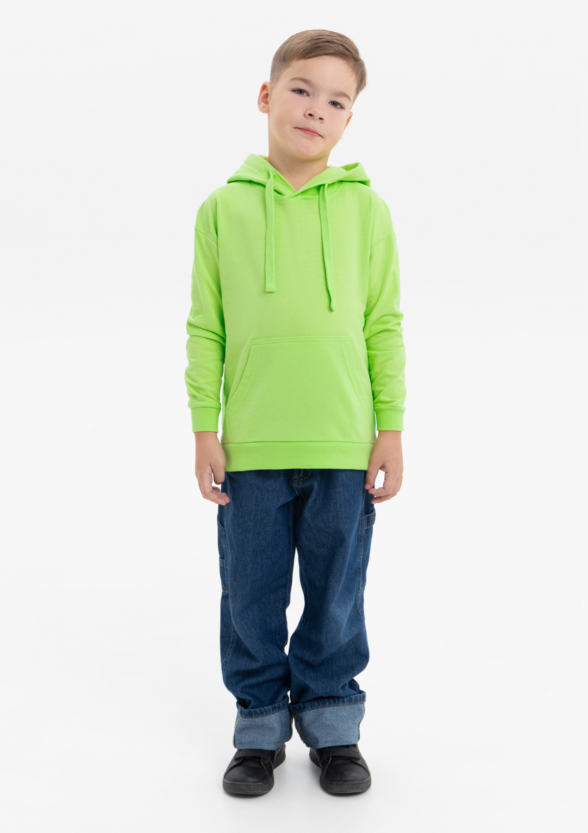 Модель прямого силуэта с капюшоном комфортной глубины, спущенной линией плеча и накладным карманом-кенгуру. Капюшон регулируется плоским шнуром, горловина спинки усилена киперной лентой. Манжет и низ изделия выполнены широкой эластичной резинкой в тон основному цвету.