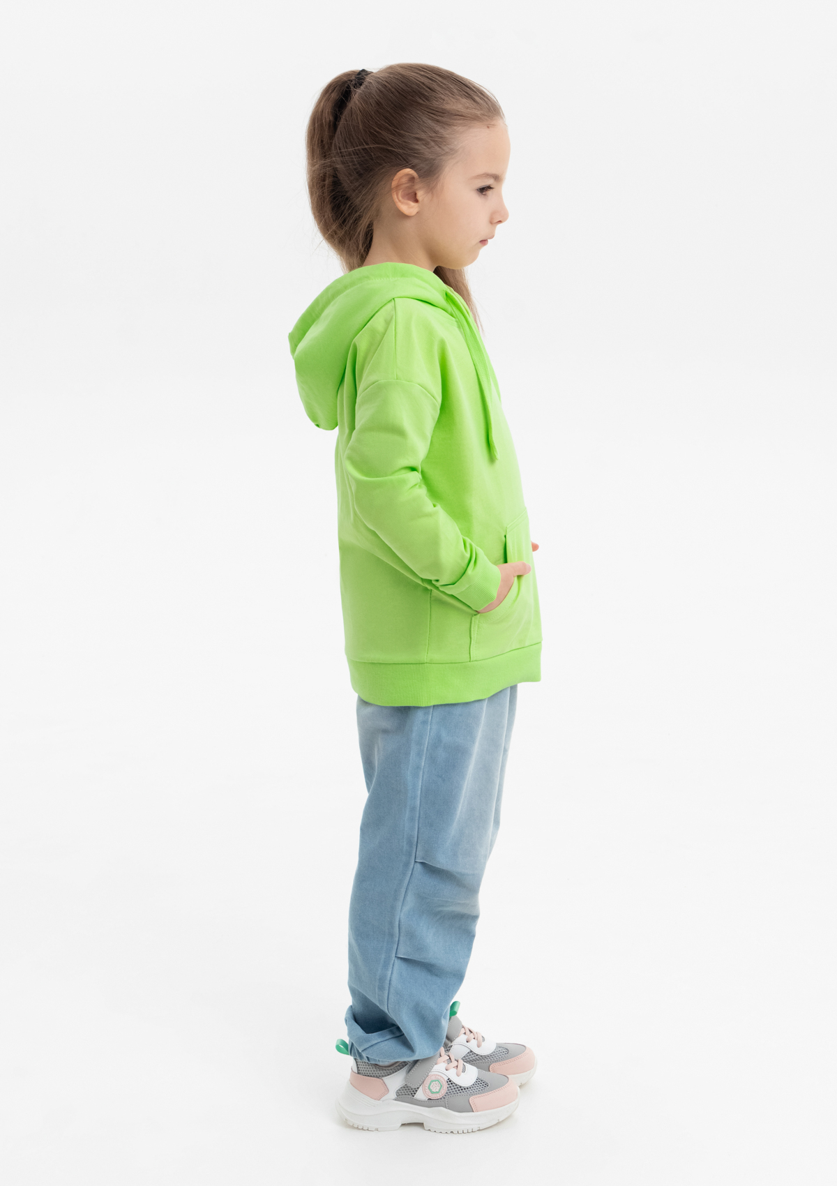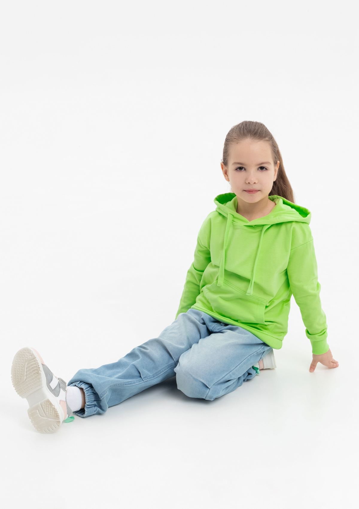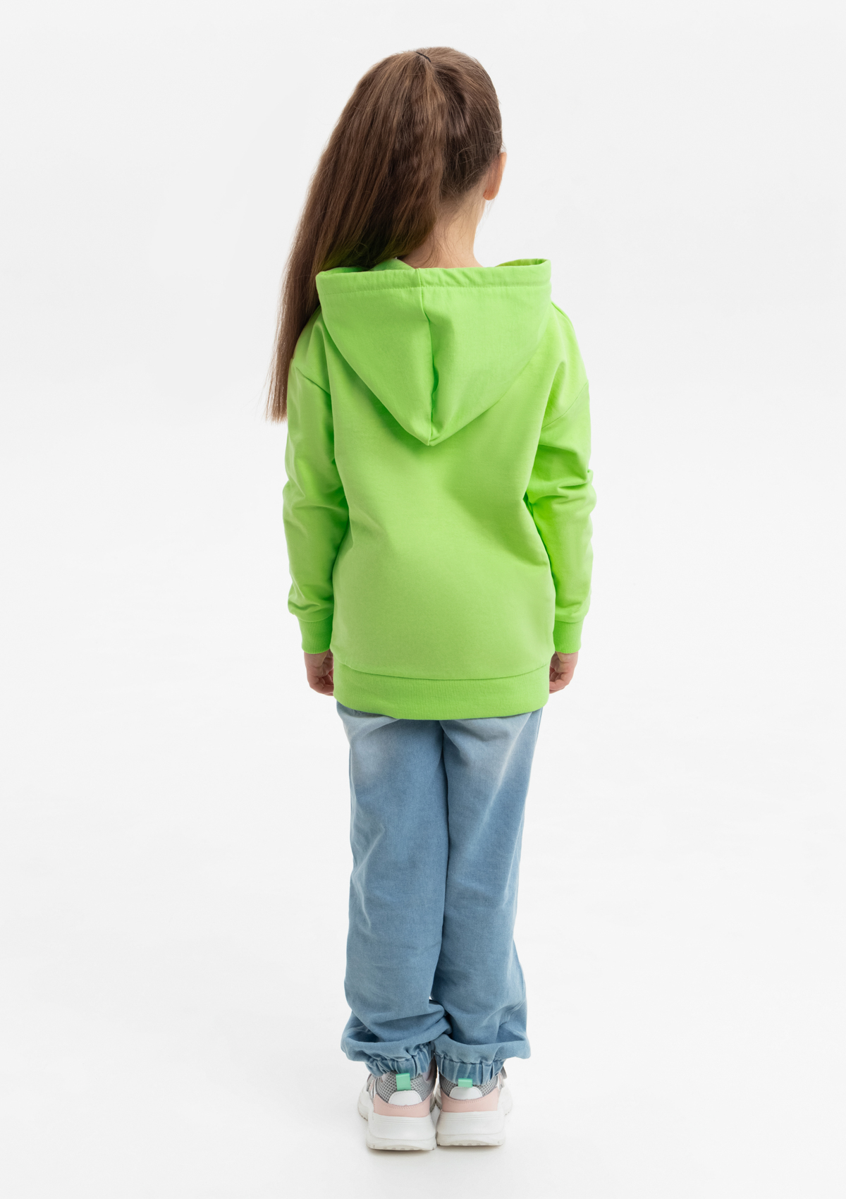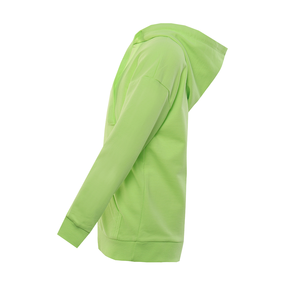 Модель прямого силуэта с капюшоном комфортной глубины, спущенной линией плеча и накладным карманом-кенгуру. Капюшон регулируется плоским шнуром, горловина спинки усилена киперной лентой. Манжет и низ изделия выполнены широкой эластичной резинкой в тон основному цвету.