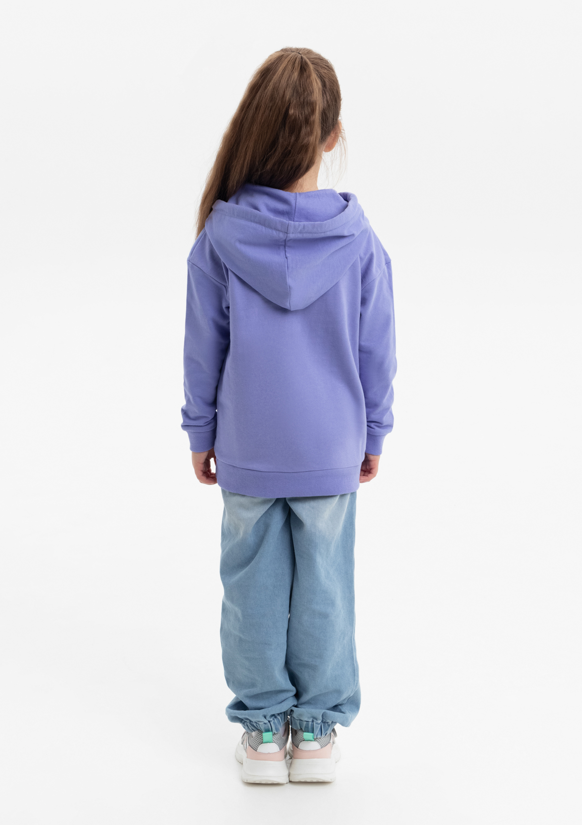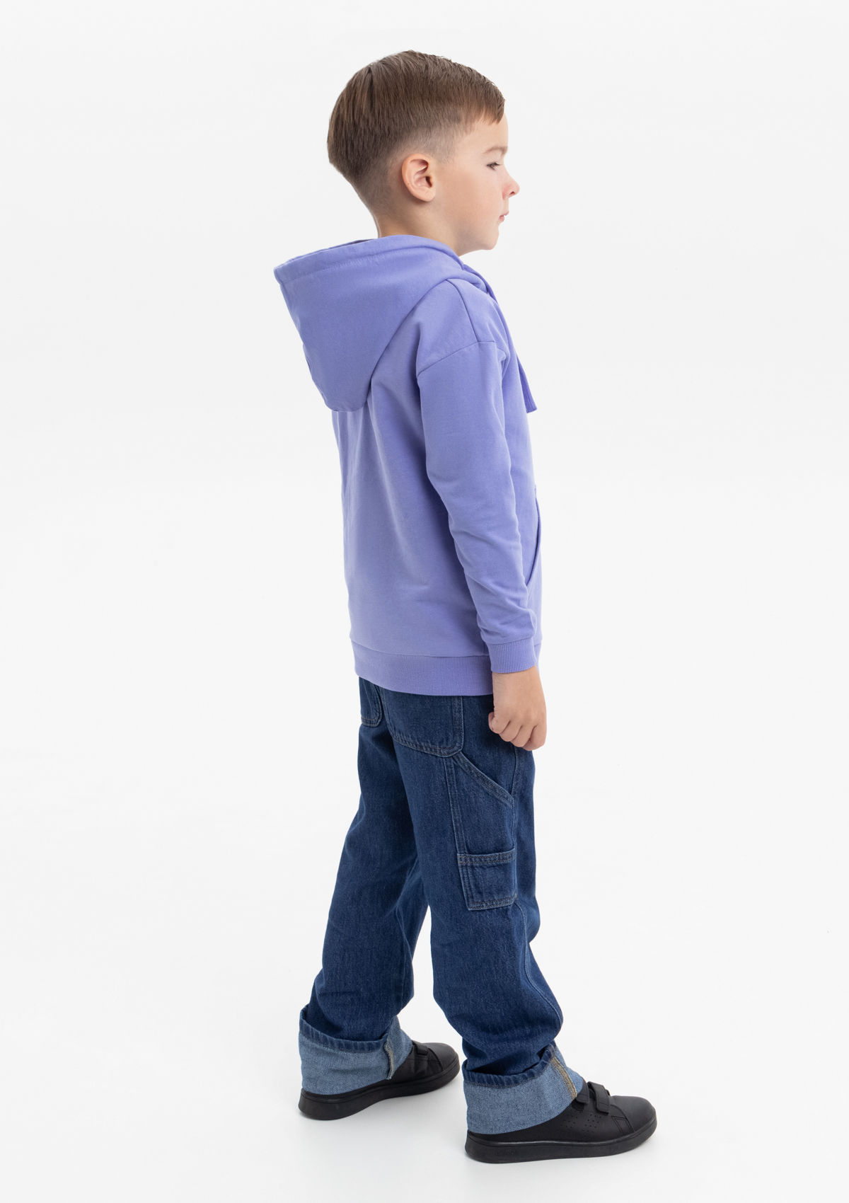 Модель прямого силуэта с капюшоном комфортной глубины, спущенной линией плеча и накладным карманом-кенгуру. Капюшон регулируется плоским шнуром, горловина спинки усилена киперной лентой. Манжет и низ изделия выполнены широкой эластичной резинкой в тон основному цвету.