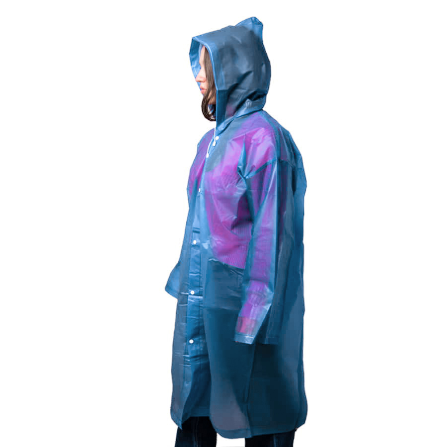 Дождевик "Pure" из непромокаемого материала EVA, толщиной 0,16 мм. Один размер, длина 118 см, ширина под грудью 68 см. Соответствует размеру XL-2XL. Прямой силуэт, втачной рукав, капюшон с завязками. Застёжка на кнопках, капюшон. -