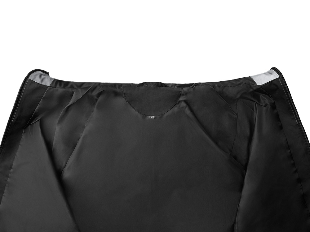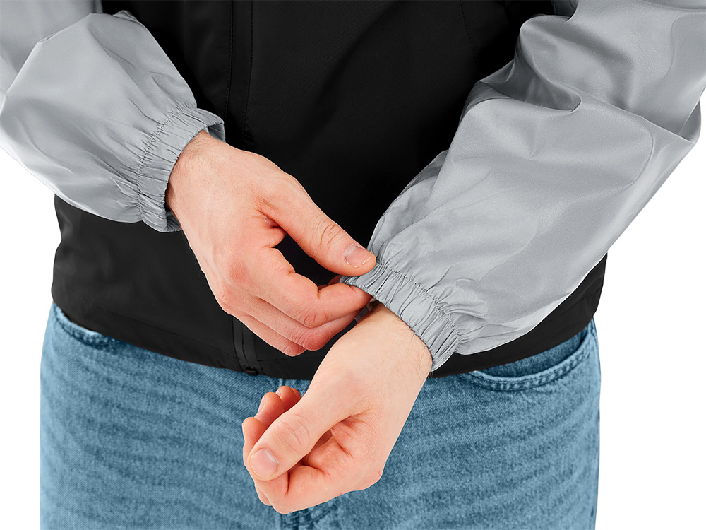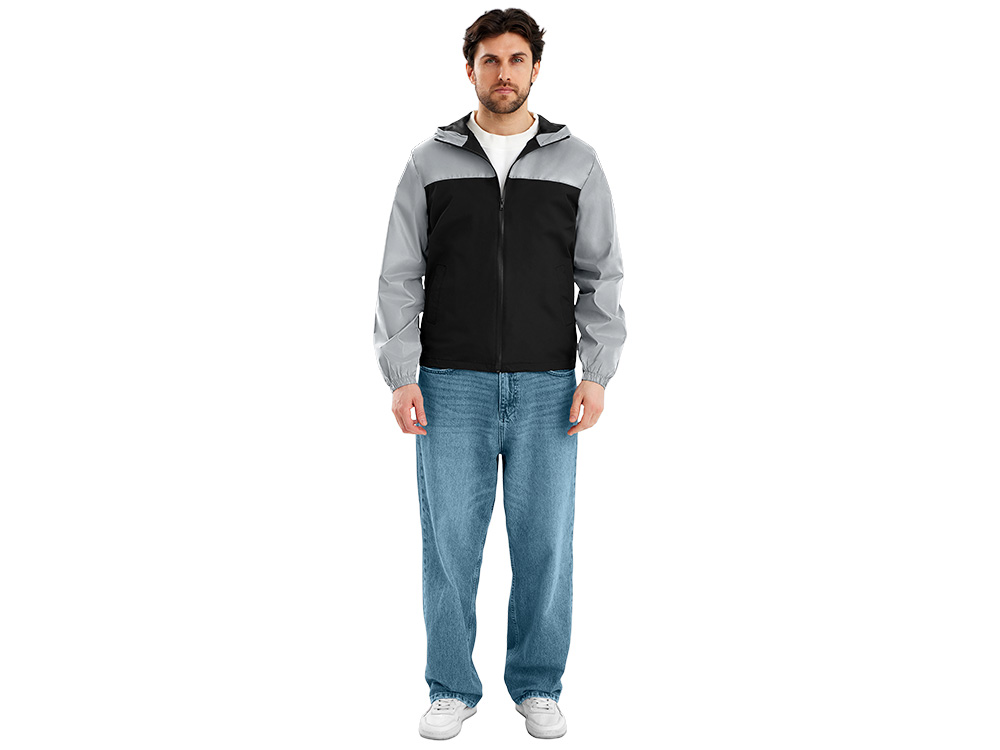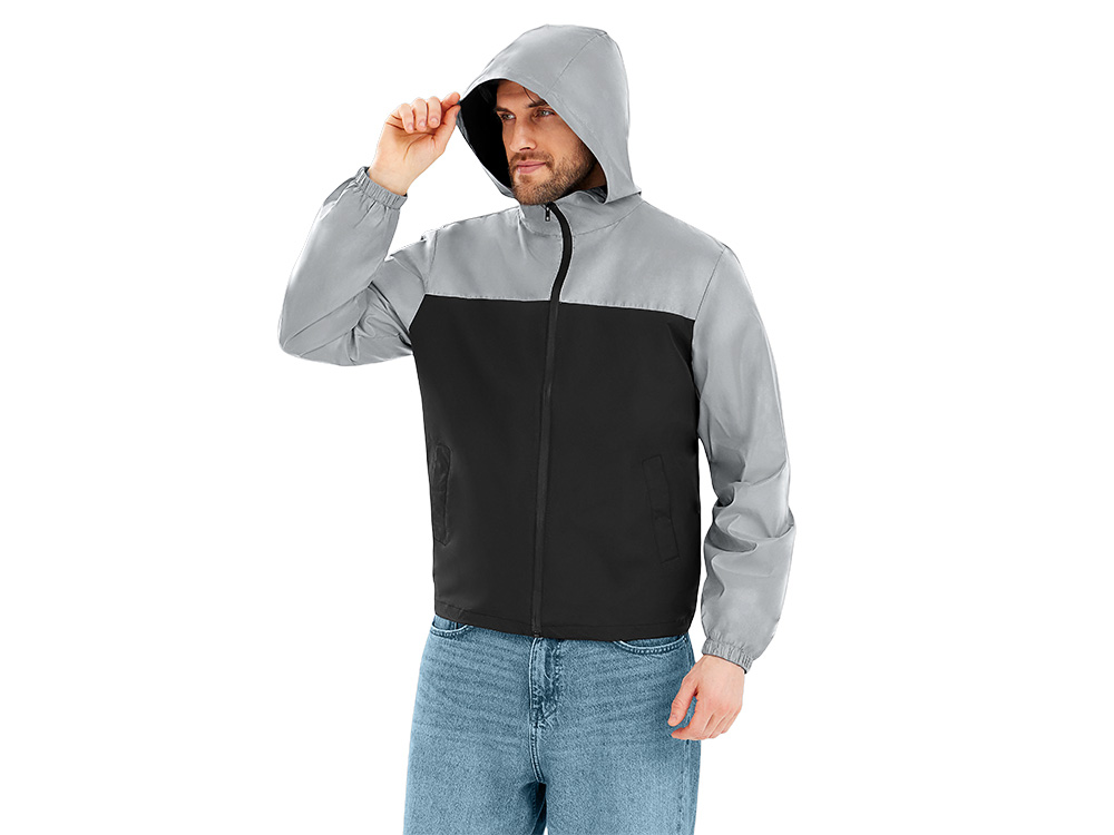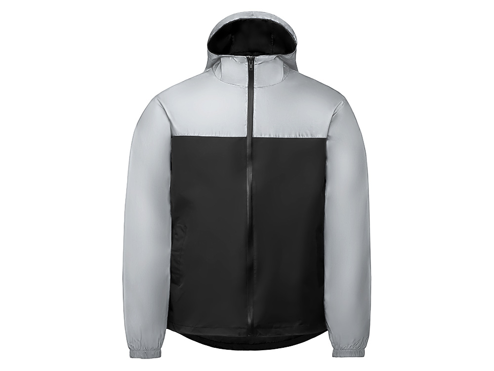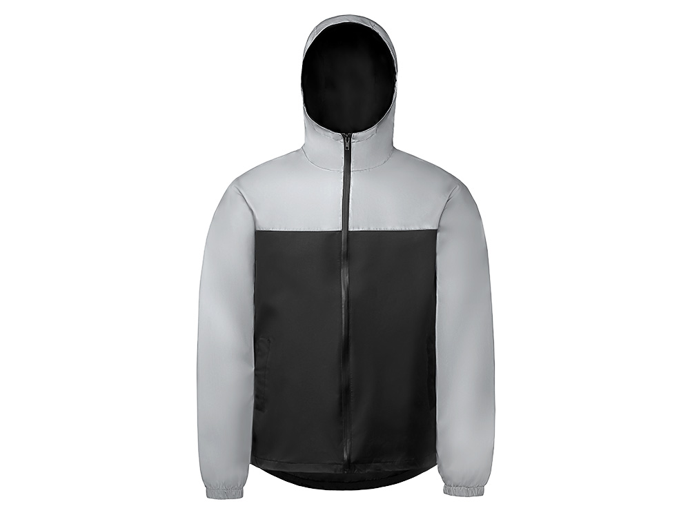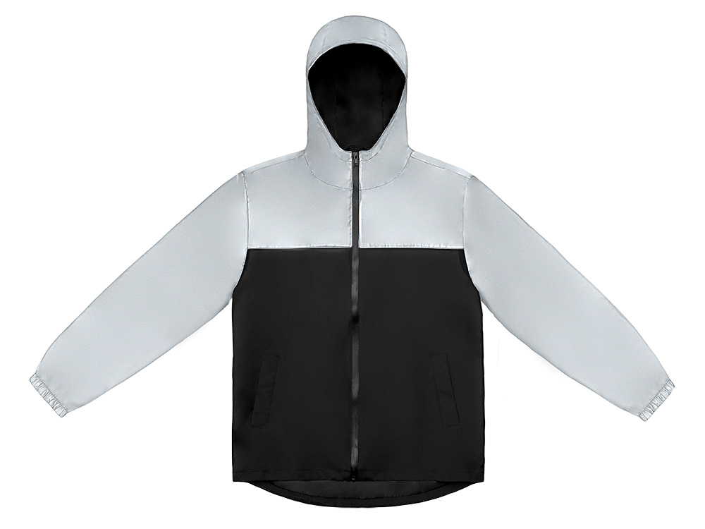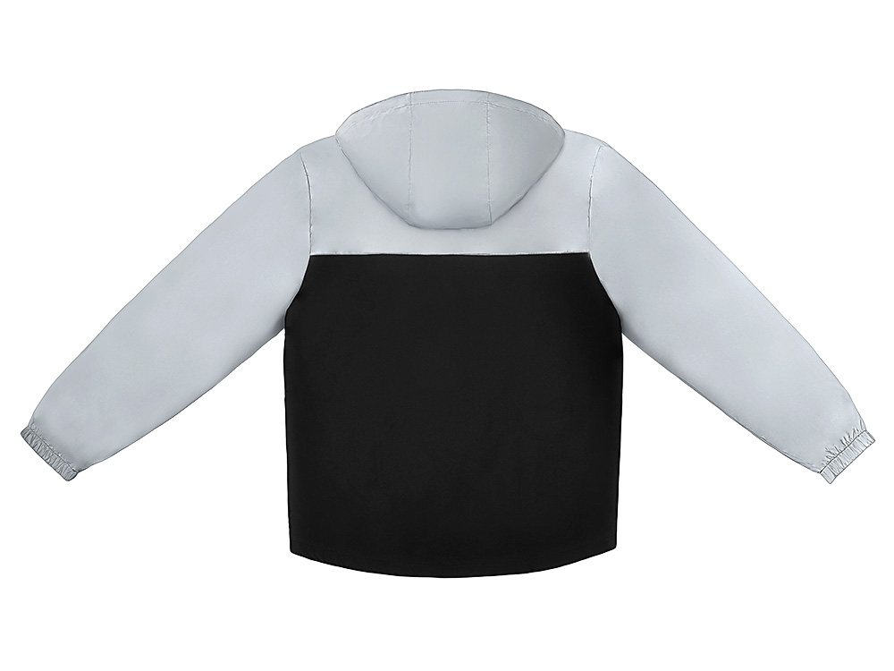 Streetwear-ветровка с контрастным дизайном: верх переда и спинки, рукава и капюшон — из светоотражающей ткани, низ — из прочной чёрной полиэстеровой ткани. Модель на подкладке, со спинкой длиннее переда.