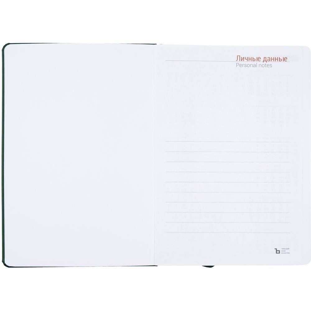 Ежедневник с твердой обложкой, выполнен из материала Latte, зеленый FF, дополнен ляссе в цвет обложки.Блок 207, с информационным блоком: