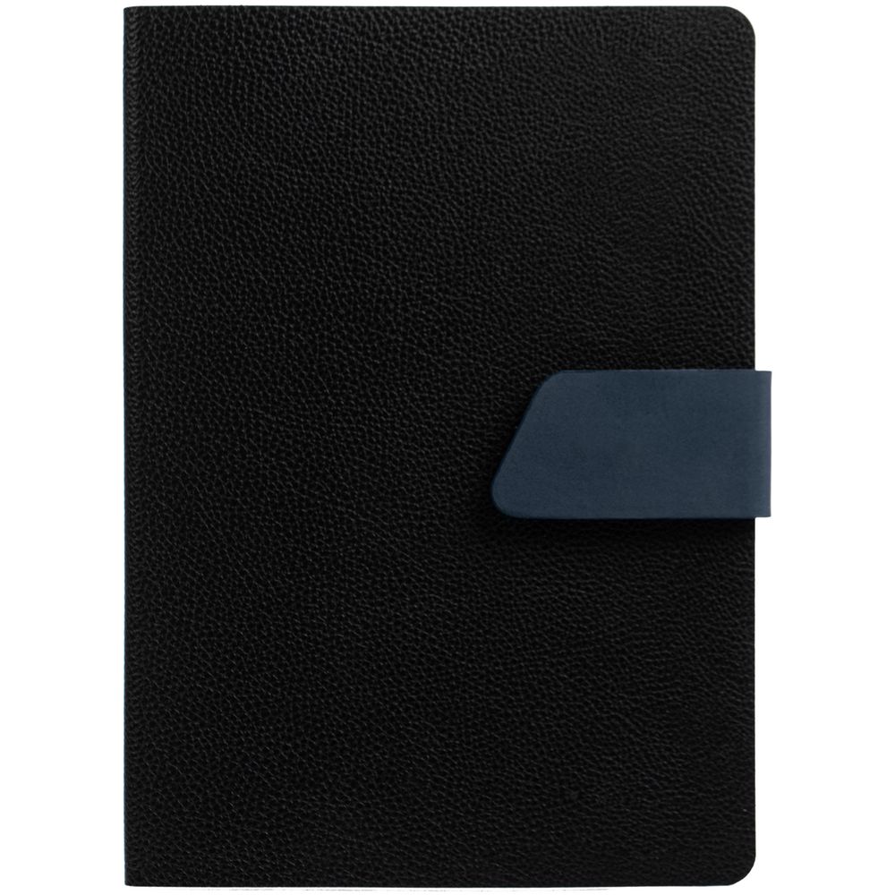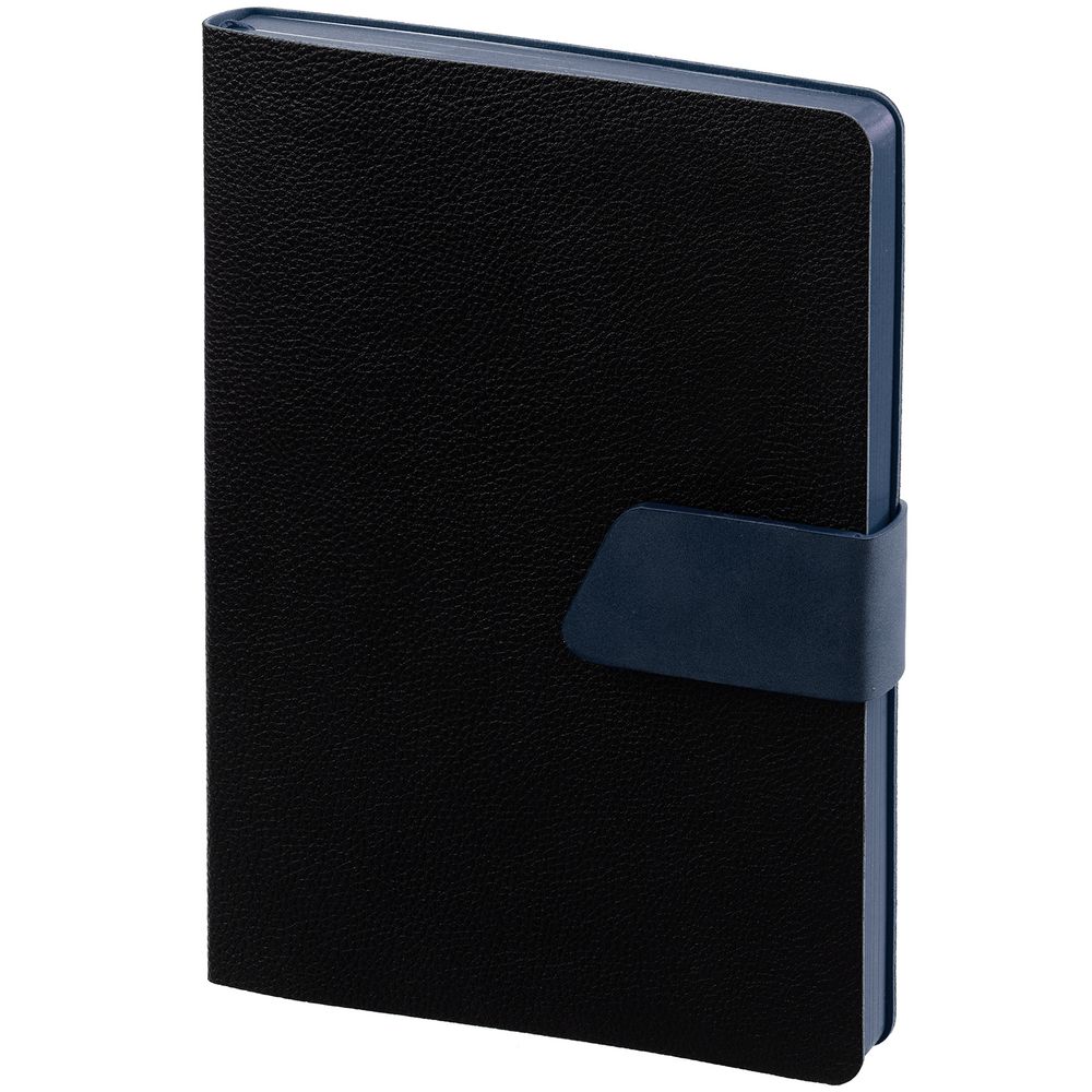 Ежедневник с гибкой обложкой, выполнен из материала La Fite, черный АА и Nubuck, темно-синий ХХ, дополнен синим ляссе и хлястиком на кнопке.