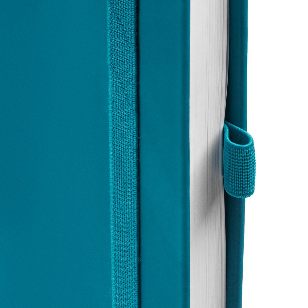 Ежедневник с твердой обложкой без поролона, выполнен из материала Soft Touch, цвет морской волны II, дополнен резинкой шириной 1 см, петлей-резинкой для ручки, капталом и ляссе темно-бирюзового цвета.