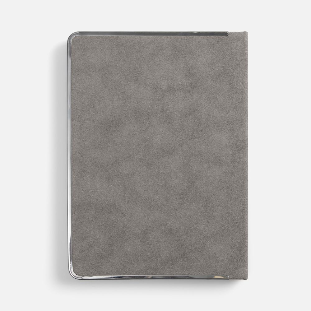 Ежедневник с твердой обложкой и серебристым обрезом блока. Выполнен из материала Nubuck, серый СС, дополнен серым ляссе и металлическими рамками с двух сторон обложки.