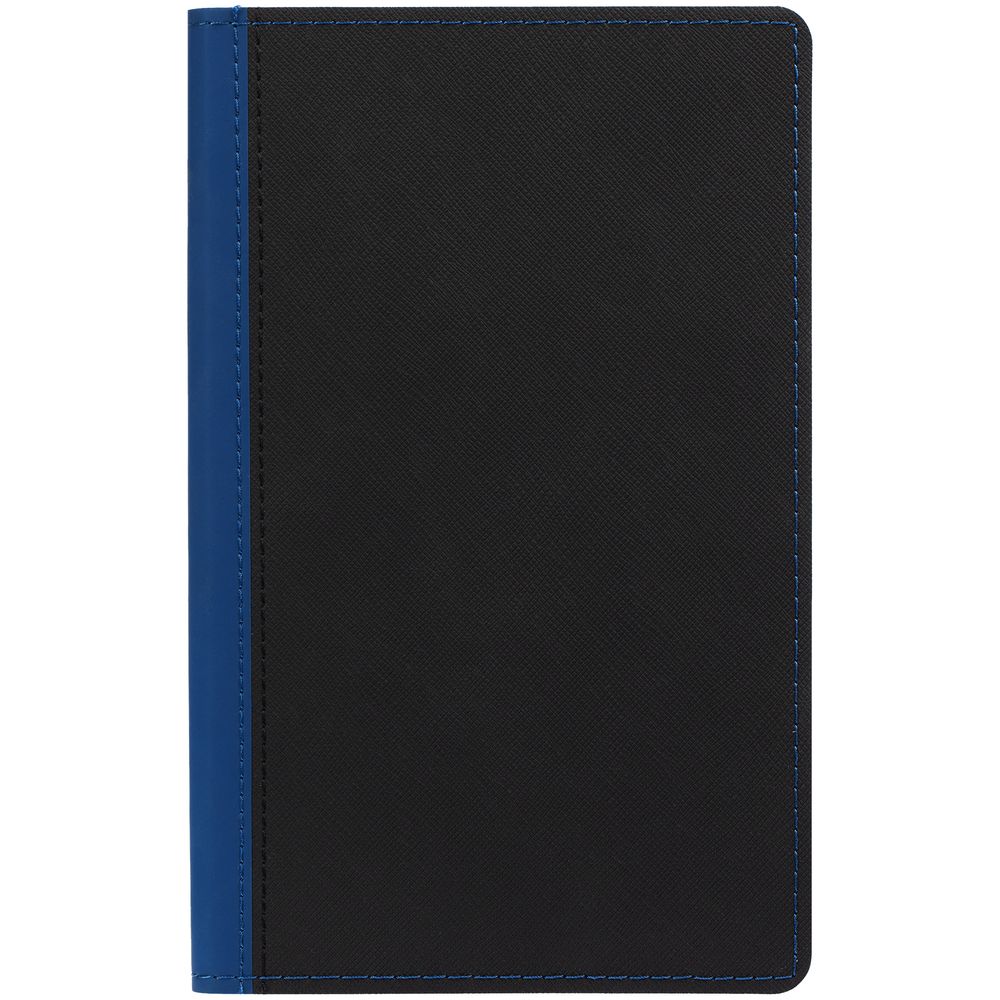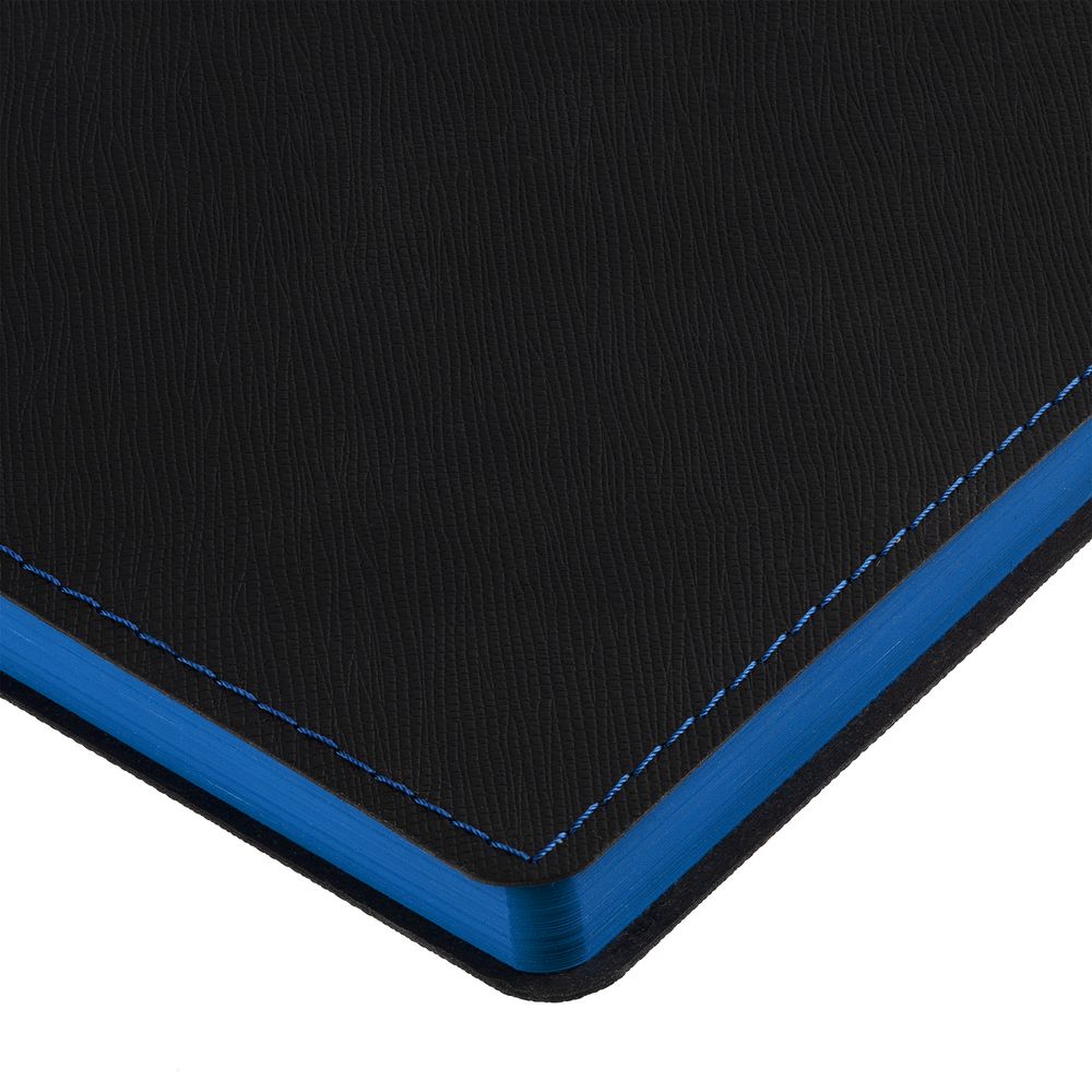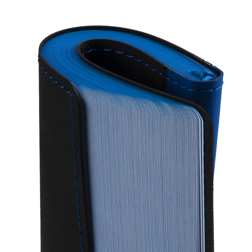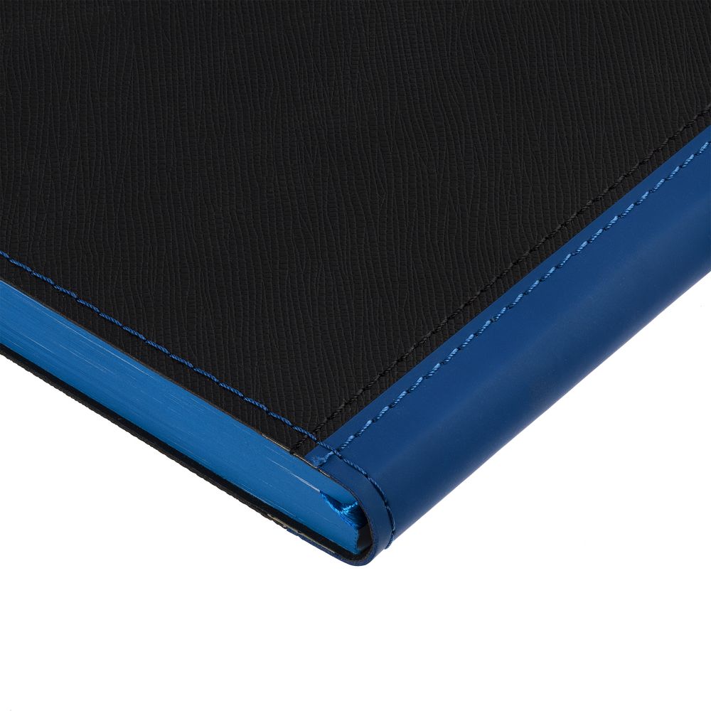 Стильный двухцветный ежедневник с гибкой обложкой и цветным обрезом.Ежедневник с гибкой обложкой выполнен из материала Nice Touch, черный АА и Soft Touch Ultra, синий НН, дополнен ляссе гсинего цвета.