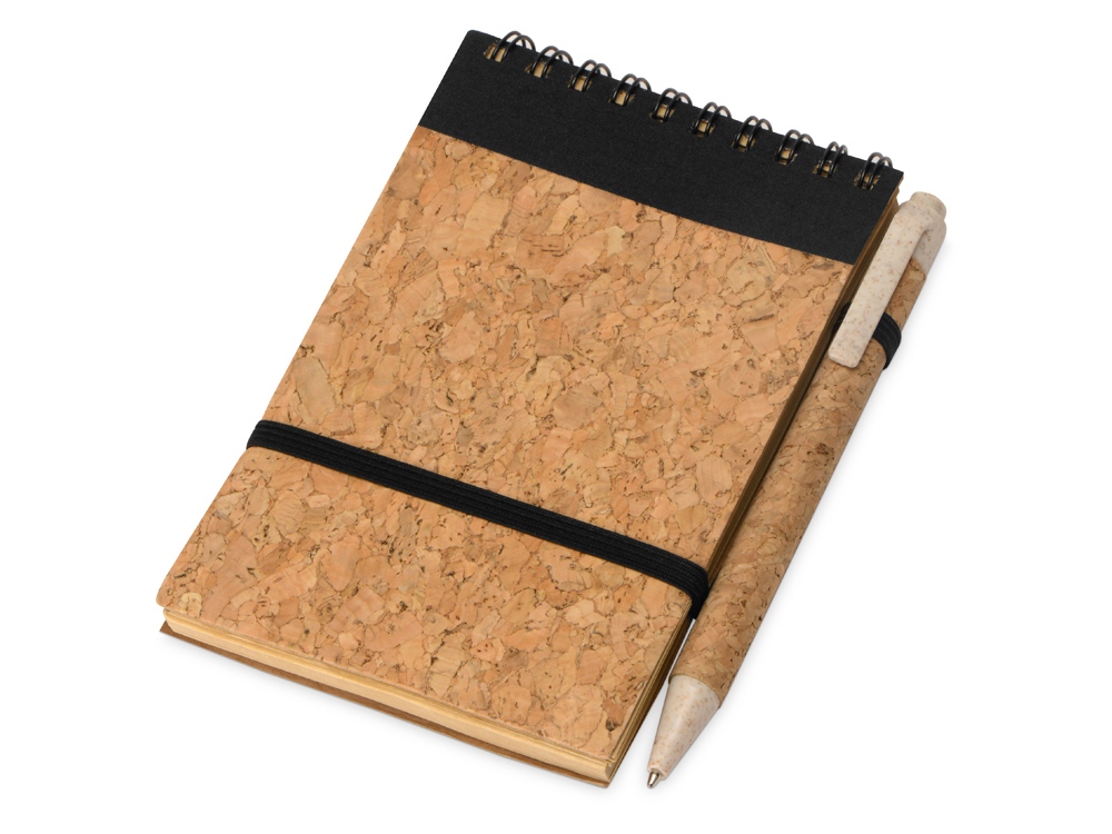 Оригинальный блокнот с обложкой из пробки и картона, а также блоком из переработанной бумаги. Петля для ручки и горизонтальная резинка расширяют функциональность. -