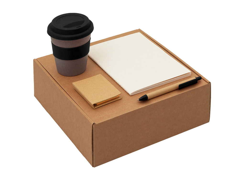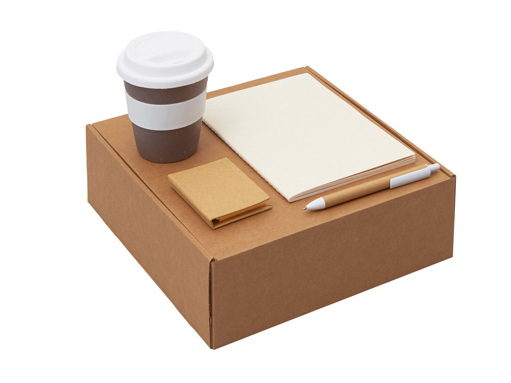 блокнот- бумага из переработанных тетра-паков, ручка- картон, пластик, стакан- 50% бамбуковое волокно, 50% полипропилен, коробка- картон