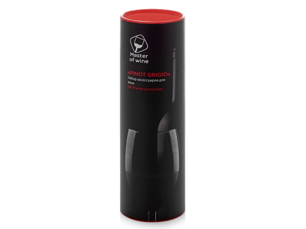 В винном наборе Pinot Grigio собрано все, что необходимо для откупоривания, подачи и длительного хранения вина. Аксессуары поставляются в эффектном красном тубусе и брендированном шубере.