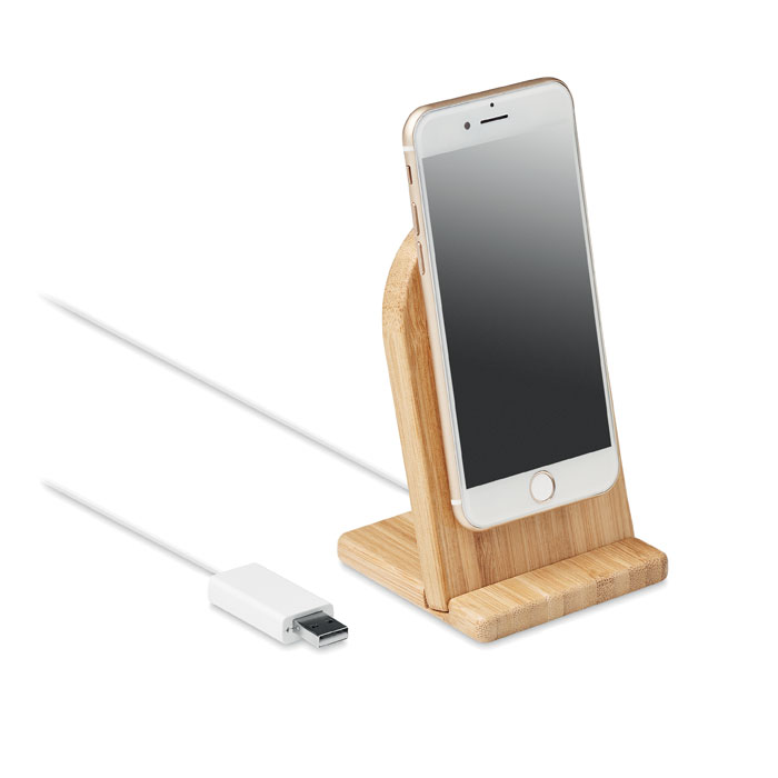 Магнитная б/п зарядка из бамбука с подставкой. Выход: DC 9V/1.1A (10W). Совместимо с iPhone® 12 и новее. Включает металлическое кольцо для зарядки дополнительных устройств, поддерживающих функции б/п зарядки. -