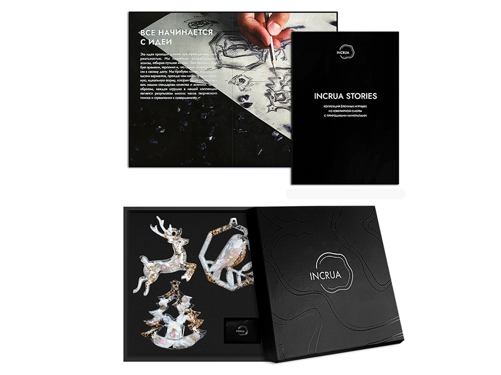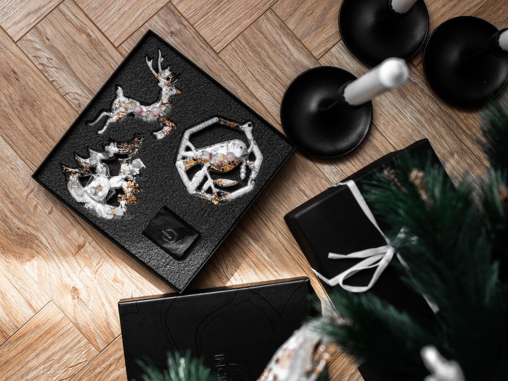 Набор из 3-х елочных игрушек: в форме оленя, снегиря и елки. Игрушки выполнены из ювелирной эпоксидной смолы и украшены галтовкой из натуральных минералов.
