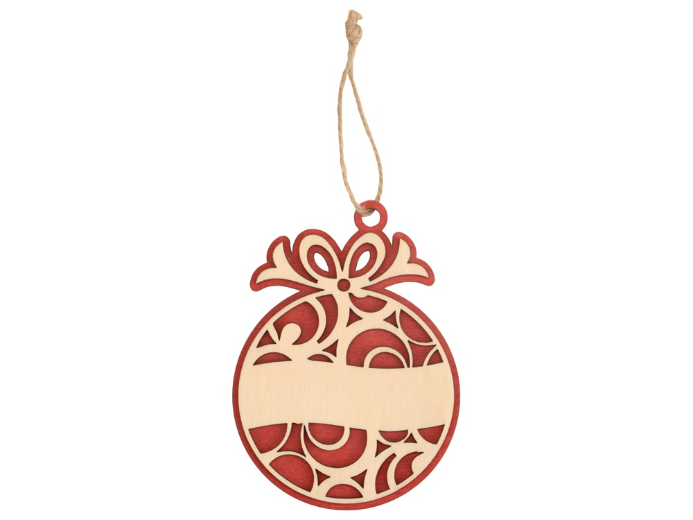 Оригинальное елочное украшение в виде ажурного новогоднего шара выполнено из березовой фанеры и тонировано в красный цвет. Поле для нанесения – широкая лента, обхватывающая шар, на которой ваши пожелания или логотип будут смотреться как нельзя уместно, органично вписываясь в облик изделия. -