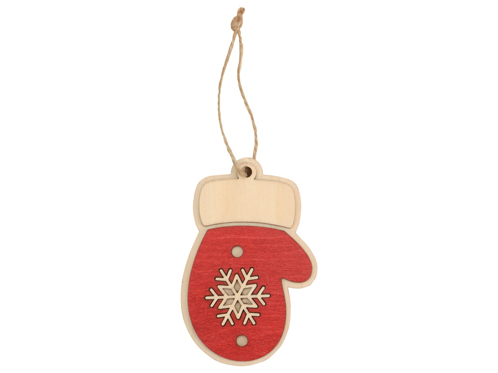 Трогательная елочная игрушка в виде новогодней варежки – атмосферный и праздничный сувенир. Подвеска изготовлена из березовой фанеры и украшена тонировкой красного цвета. Текстура натурального материала и объем игрушки, выполненной в два слоя, делают ее приятной не только внешне, но и тактильно. -