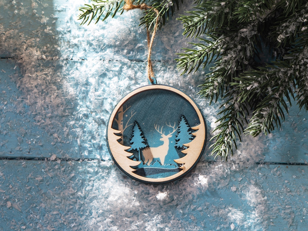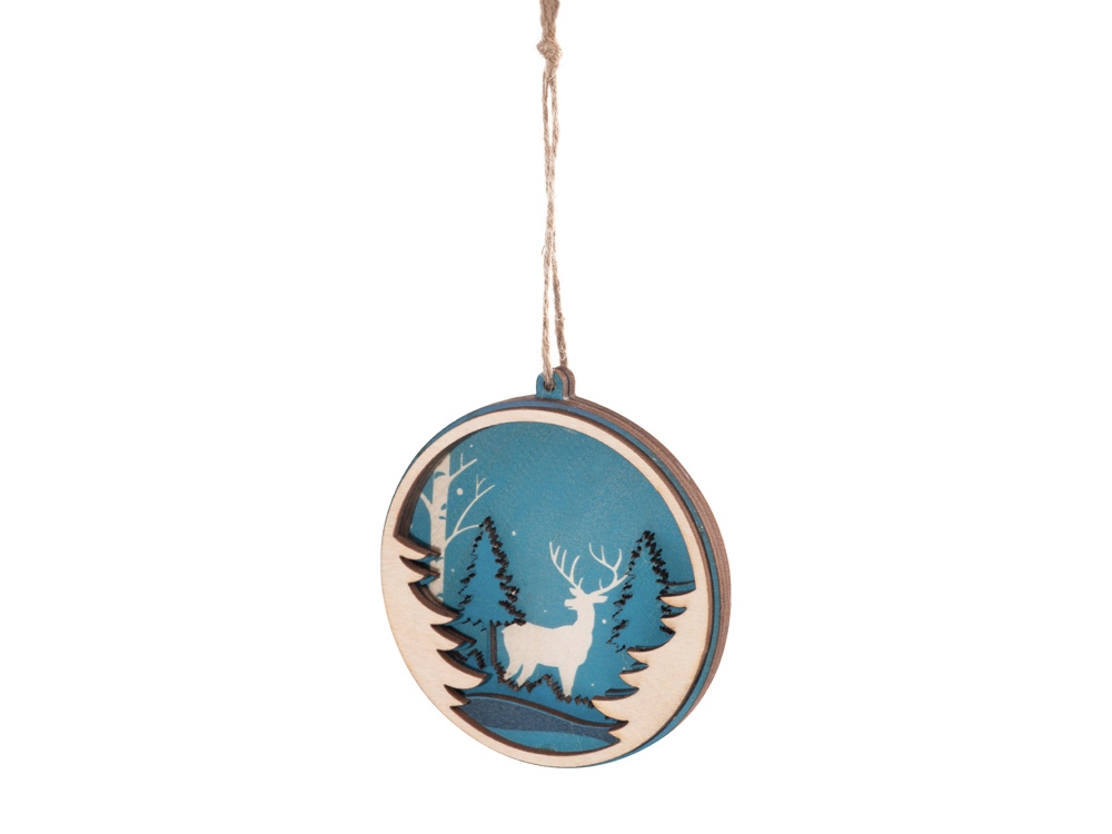 Игрушка выполнена из трех слоев фанеры и прекрасно подходит для того, чтобы украсить новогодний набор, подарок либо стать самостоятельным небольшим памятным презентом. Игрушка имеет свой рельеф: приглядитесь, и вы заметите, что фигуры пейзажа находятся на разных слоях фанеры, что придает изображению объемность. -