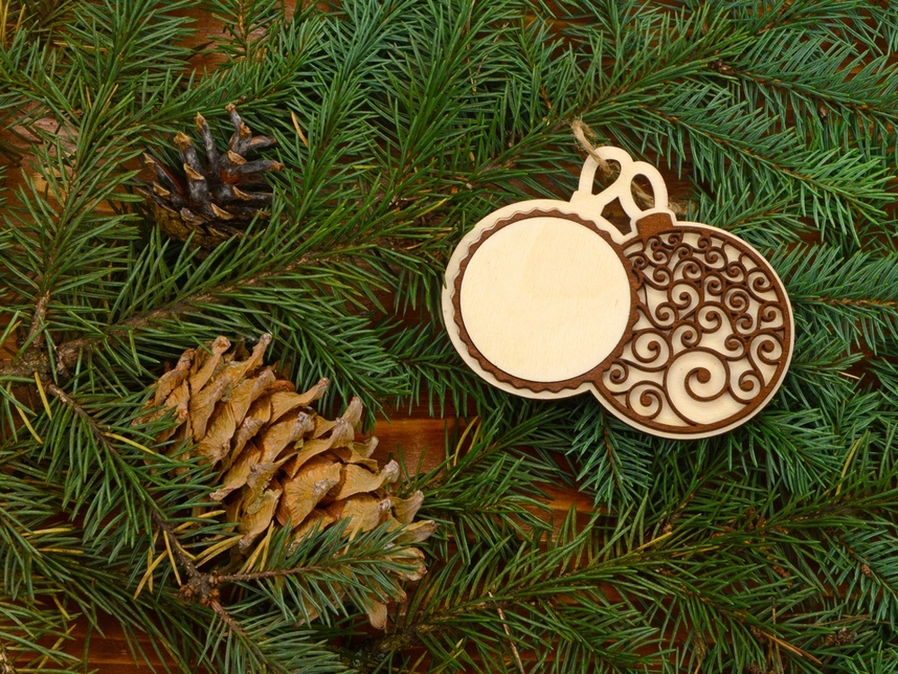 Оригинальное елочное украшение в виде пары новогодних шаров. Подвеска выполнена из березовой фанеры и тонирована в коричневый цвет с изящным орнаментом. Это елочное украшение – отличный вариант для экоелки. Не хотите использовать елочные игрушки из пластика или стекла? Деревянные сувениры из нашего каталога станут отличным украшением, которые создадут атмосферу уюта в вашем доме. -