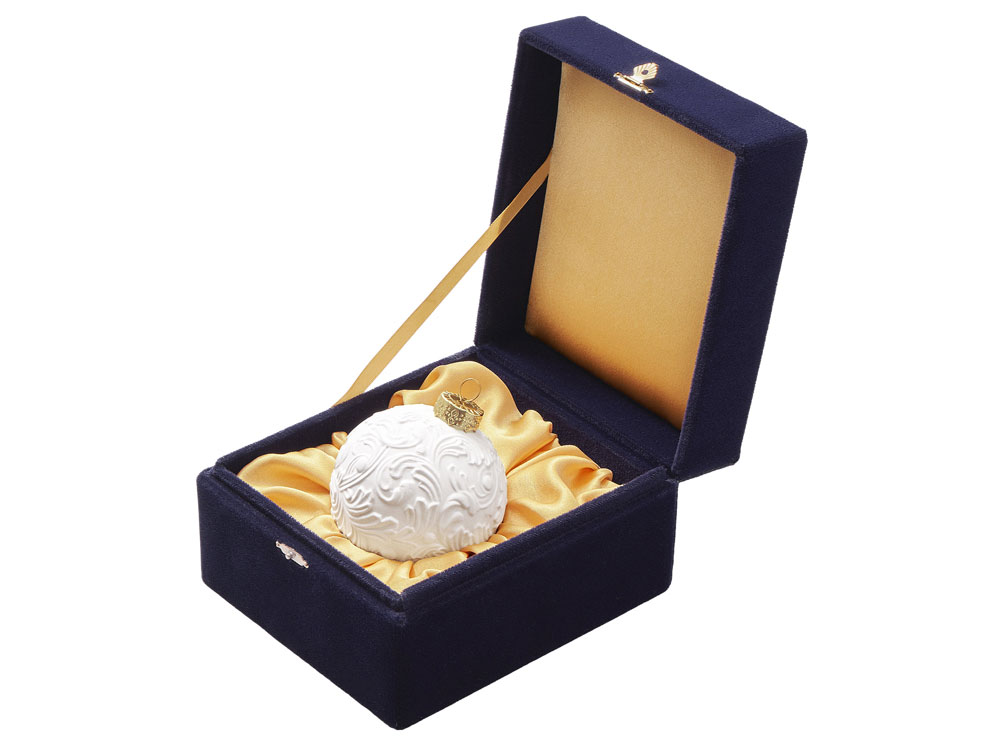 Игрушка упакована в изысканный подарочный футляр, обитый синим бархатом, что подчеркивает её ценность и делает готовым презентом для коллег и партнеров.