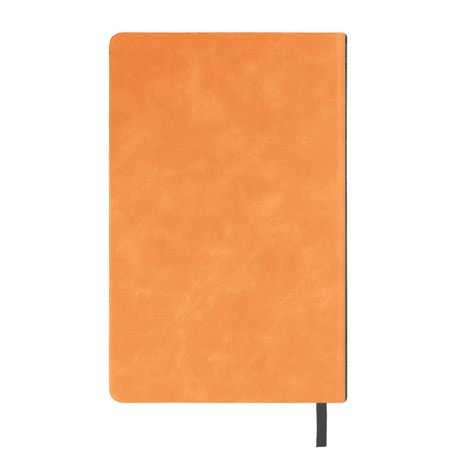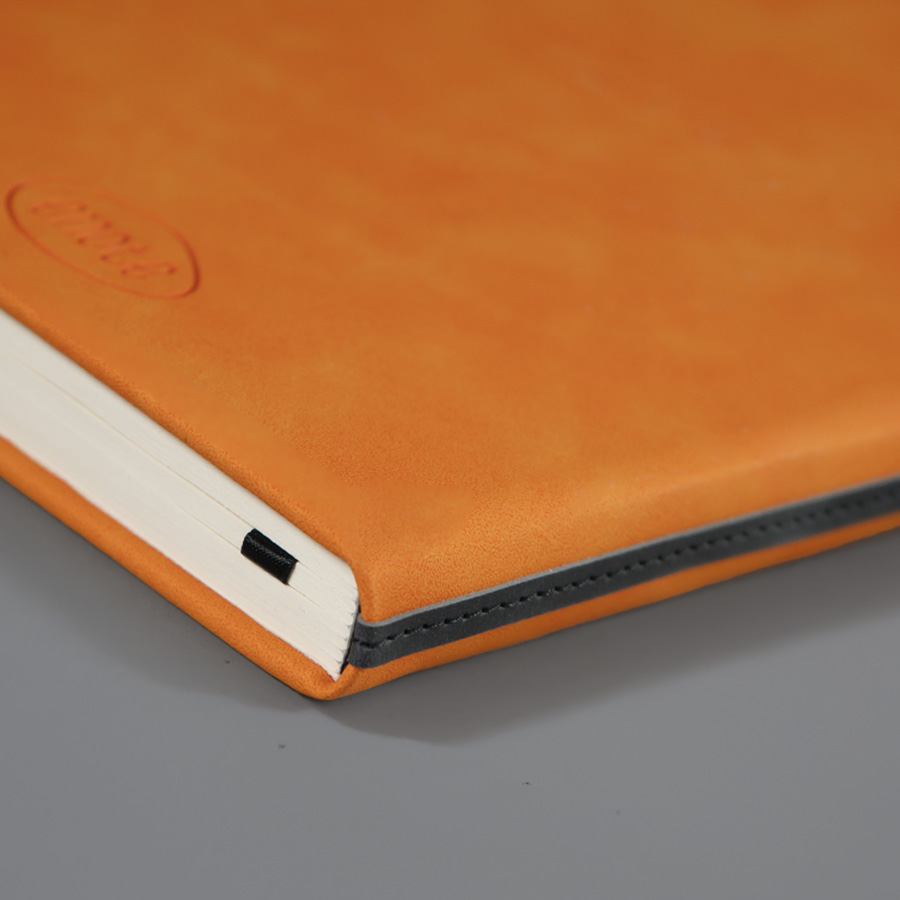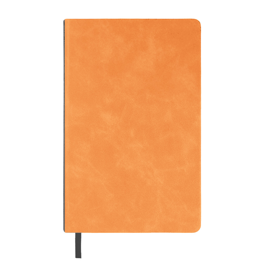 Ежедневник недатированный MuseЦвет обложки оранжевый, декоративная черная полосаРазмер 130*210 мм, переплет твердыйОбложка термоактивный PU, с эффектом замшиБлок недатированный, в линейку, скругленные углыБумага кремовая, плотность 70 г м2Форзац нахцаз кремовые272 страницыЛяссе, 7 мм, в цвет обложкиУпаковка крафтовый сливбокс -