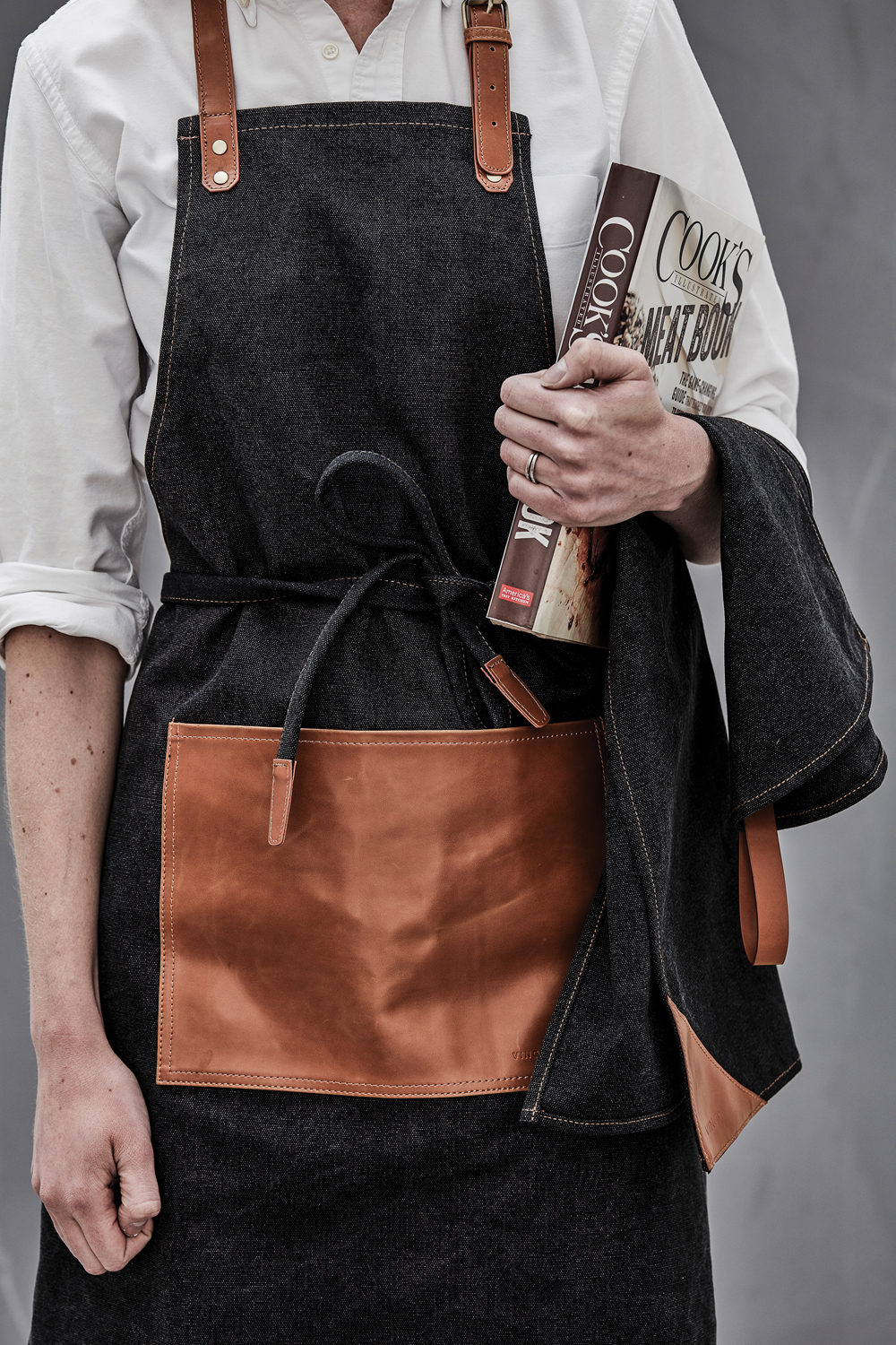 Прочный фартук из вареного канваса плотностью 500 г/м2 декорирован деталями под натуральную кожу. Благодаря текстуре ткани со временем изделие становится только лучше.