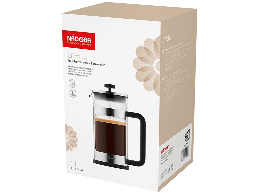 Френч-прессы серии Erich имеют колбу, выполненную из жаропрочного боросиликатного стекла. Прочный подстаканник из нержавеющей стали с пластиковой подставкой обеспечивает дополнительную термоизоляцию и предохраняет колбу от повреждений. Многослойная система фильтрации френч-прессов выполнена из высококачественной нержавеющей стали 18/10. Удобная ручка с покрытием Софт-тач не нагревается и не выскальзывает из рук. Разборная конструкция изделий и системы фильтрации облегчают легкий и качественный уход. В комплекте предусмотрена мерная ложка 7г для точной дозировки продуктов. В серию входят френч-прессы объёмом 1, 0,6 и 0,35 л. Гарантия на френч-прессы серии Erich 3 года.