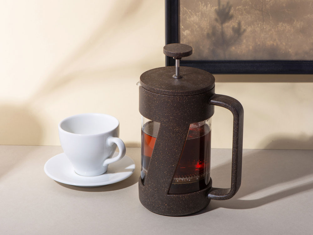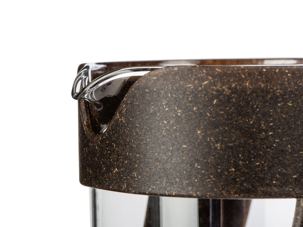 Оплетающая стеклянную колбу часть выполнена из переработанных кофейных зерен, смешанных с пластиком и древесными волокнами.