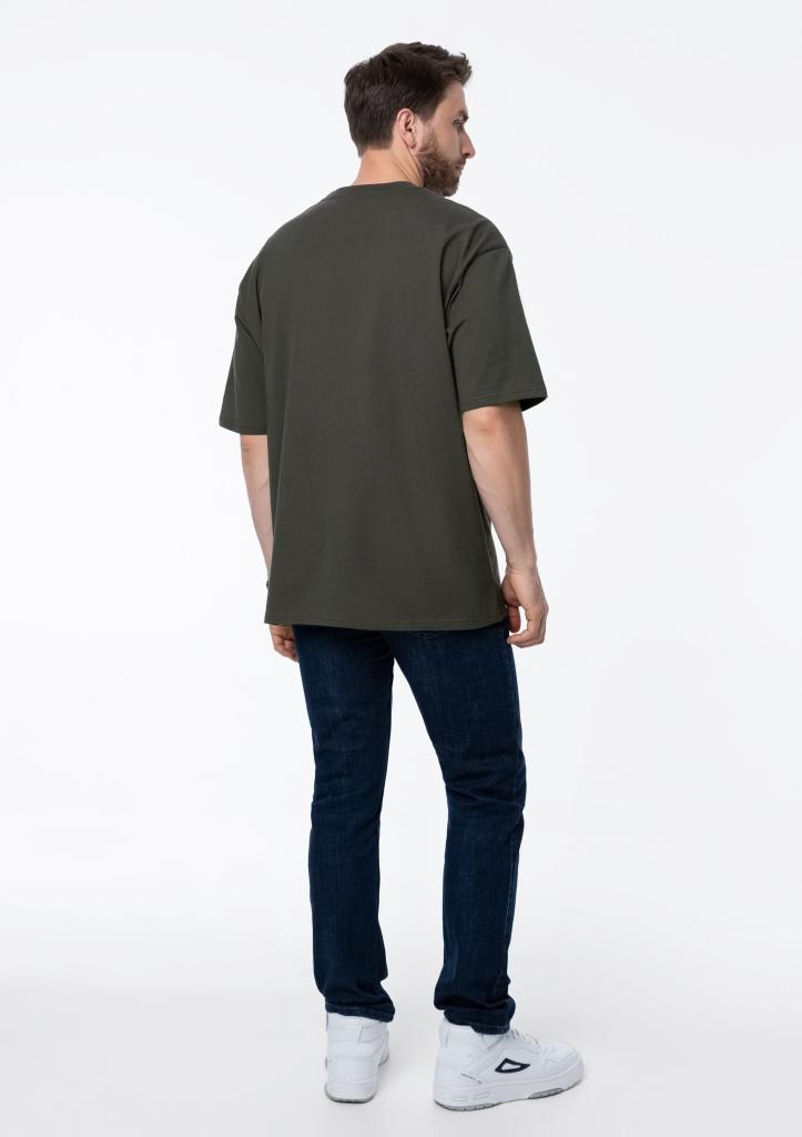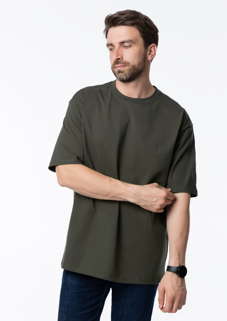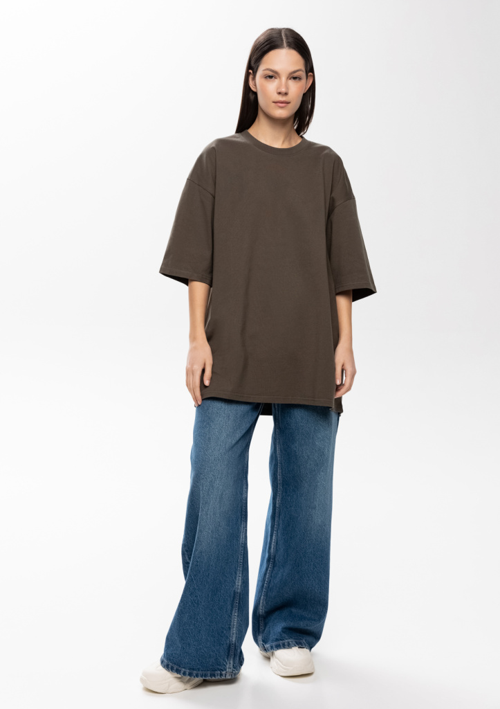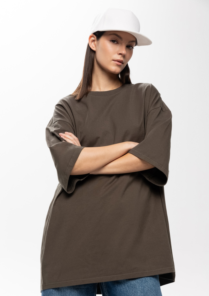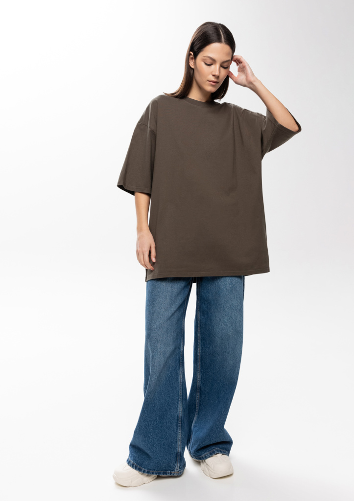Универсальная футболка силуэта-oversize с округлым воротом и спущенной линией плеча.