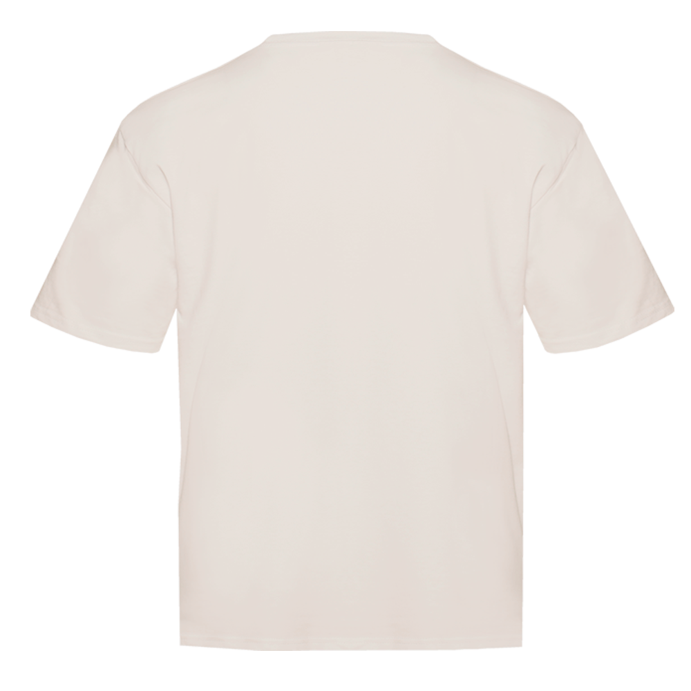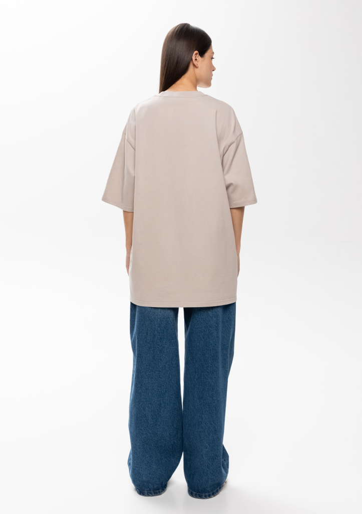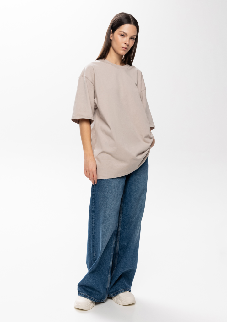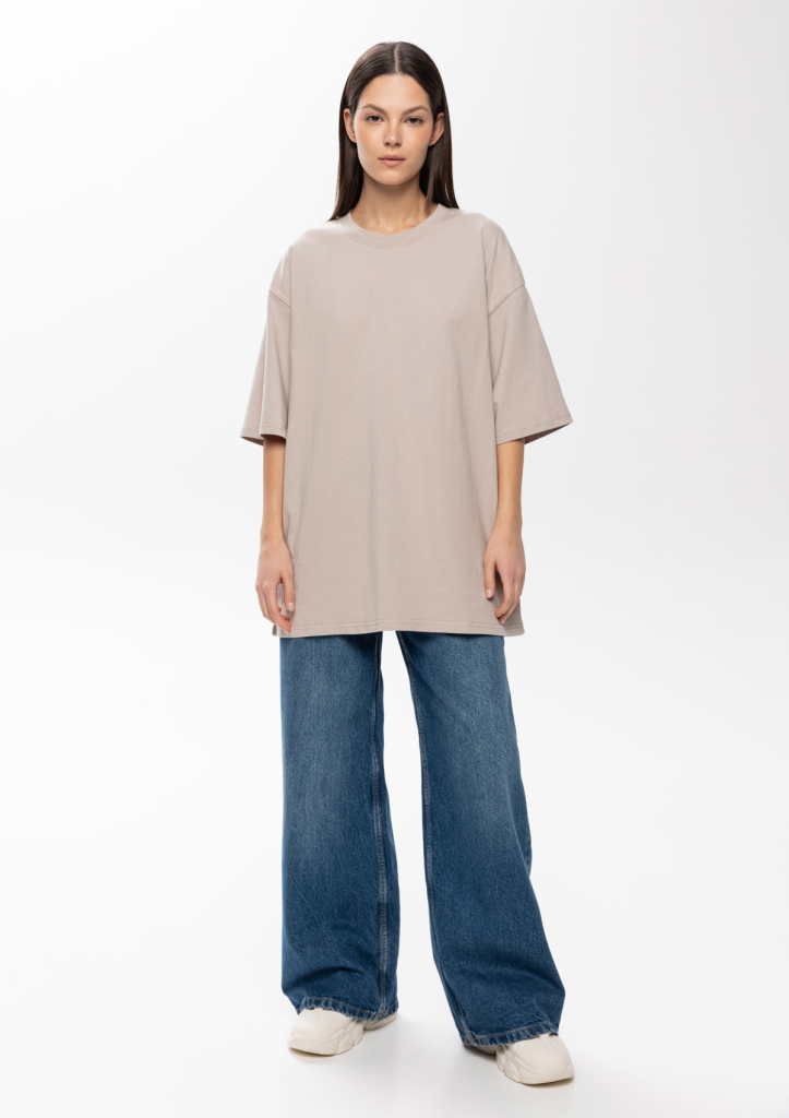 Универсальная футболка силуэта-oversize с округлым воротом и спущенной линией плеча.