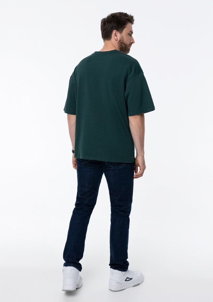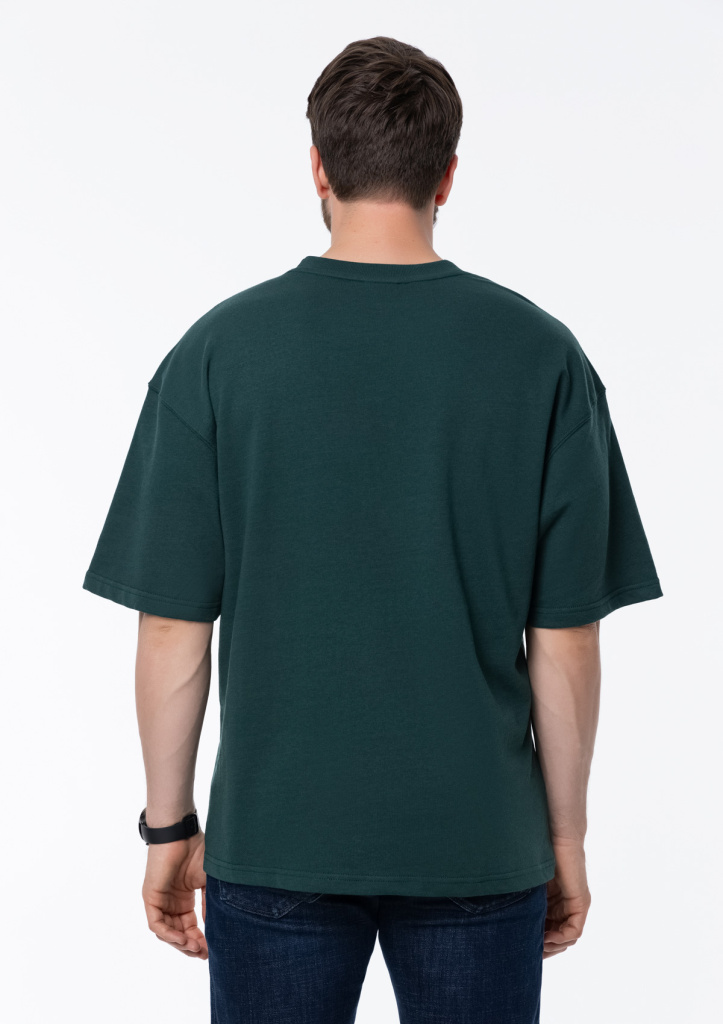 Футболка свободного кроя с округлым воротом и спущенной линией плеча. Шов горловины спинки усилен киперной лентой в тон основному цвету. Универсальная модель идеально впишется как в мужской, так и в женский гардероб.