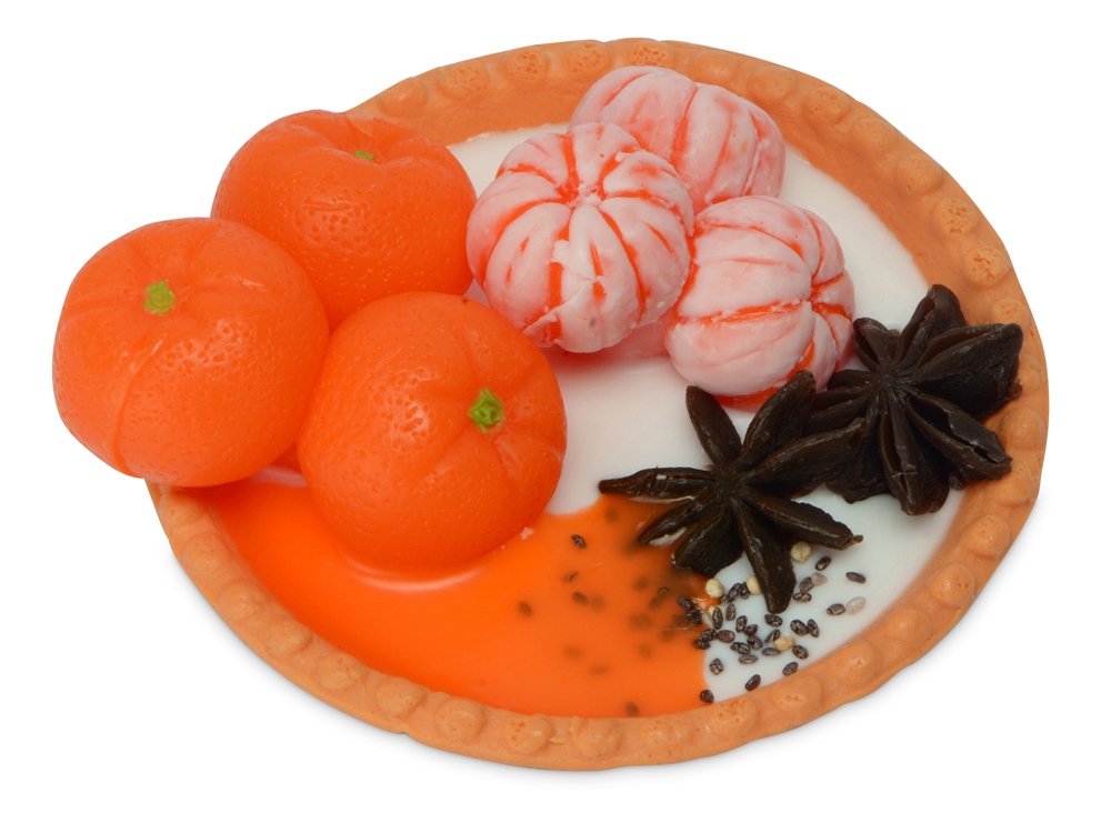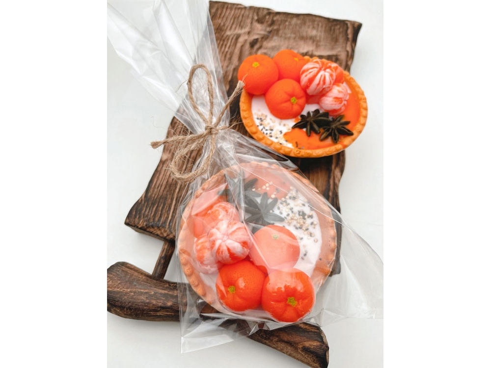 Уникальное мыло ручной работы в форме большой тарталетки с мандаринами. Основные ноты аромата на основе мандаринового-цитрусового микса.
