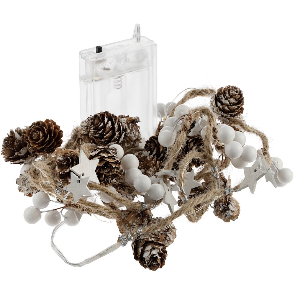 Шишки, бусины, звездочки и 20 лампочек с теплым светом. Работает от 3 батареек АА (в комплект не входят). -