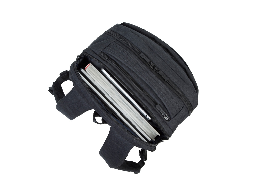 • Основное отделение для ноутбука с вертикальной загрузкой, имеет мягкие стенки, утолщенное дно и дополнительное внутреннее отделение для планшета до 10.1.