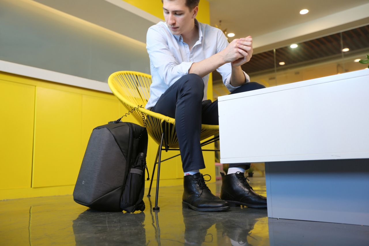 Вместительный рюкзак для путешественников ClickPack из комбинации темно-серого и черного цветов, обладатель премий Good Design Award 2017, Red Dot Design Award 2018, iF Design Award 2018, International Design Excellence Award. Сделан из прочного устойчивого к трению водоотталкивающего многослойного полиэстера, с двухслойной защитой от дождя и не требующего специального ухода. Конструкция достаточно жесткая, не деформируется. Детально продуманная организация отделений позволяет грамотно распределить вес. Самые тяжелые предметы располагаются ближе к спине, например, в отделении для ноутбука диагональю и в кармане для планшета. Благодаря плотным перегородкам и эластичным фиксаторам ноутбук и планшет надежно фиксируются и не перемещаются при ходьбе. Специальная анатомическая конструкция и вентилируемая мягкая спинка снижают нагрузку на плечи и спину, вес рюкзака воспринимается на 20-25% легче, чем при использовании стандартных моделей рюкзаков.