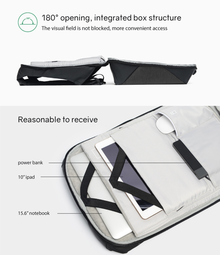 Конструкция рюкзака позволяет раскрыть его на 180°, чтобы аккуратно уложить в рюкзак много различных предметов. Дополнительно в основном отделении расположены еще 8 карманов различного функционала. 6 открытых карманов под ручки и различные мелочи, 1 карман на молнии и карман на липучке для powerbank, в который приходит USB-кабель системы зарядки K EasyCharging, соединенный с USB-портом в борту на внешней стороне рюкзака для легкого подключения к смартфону.
