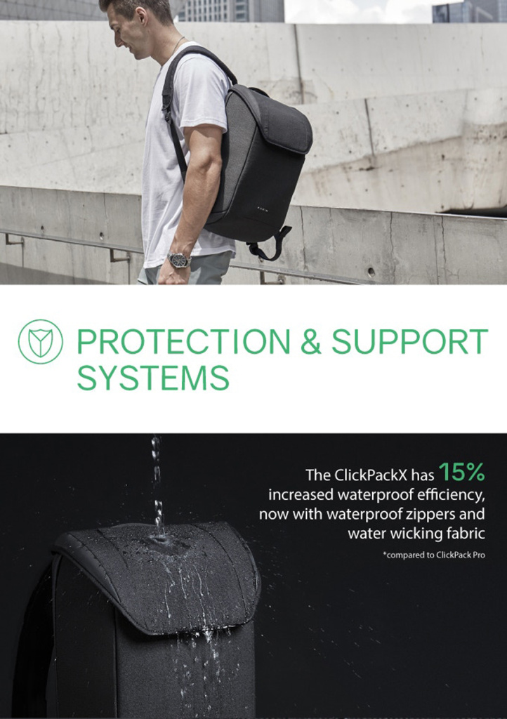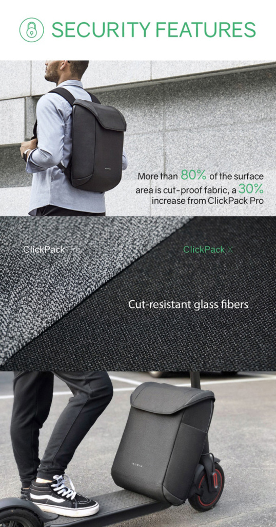 Вместительный городской рюкзак ClickPack X черного цвета, обладатель премии iF Design Award 2020. Сделан из свехпрочного устойчивого к порезам и трению водоотталкивающего полиэстера многослойного плетения. Сочетание полиэстера и стекловолокна защищает от порезов ножом или другими острыми предметами. Конструкция достаточно жесткая, не деформируется. Детально продуманная организация отделений позволяет грамотно распределить вес. Самые тяжелые предметы располагаются ближе к спине.