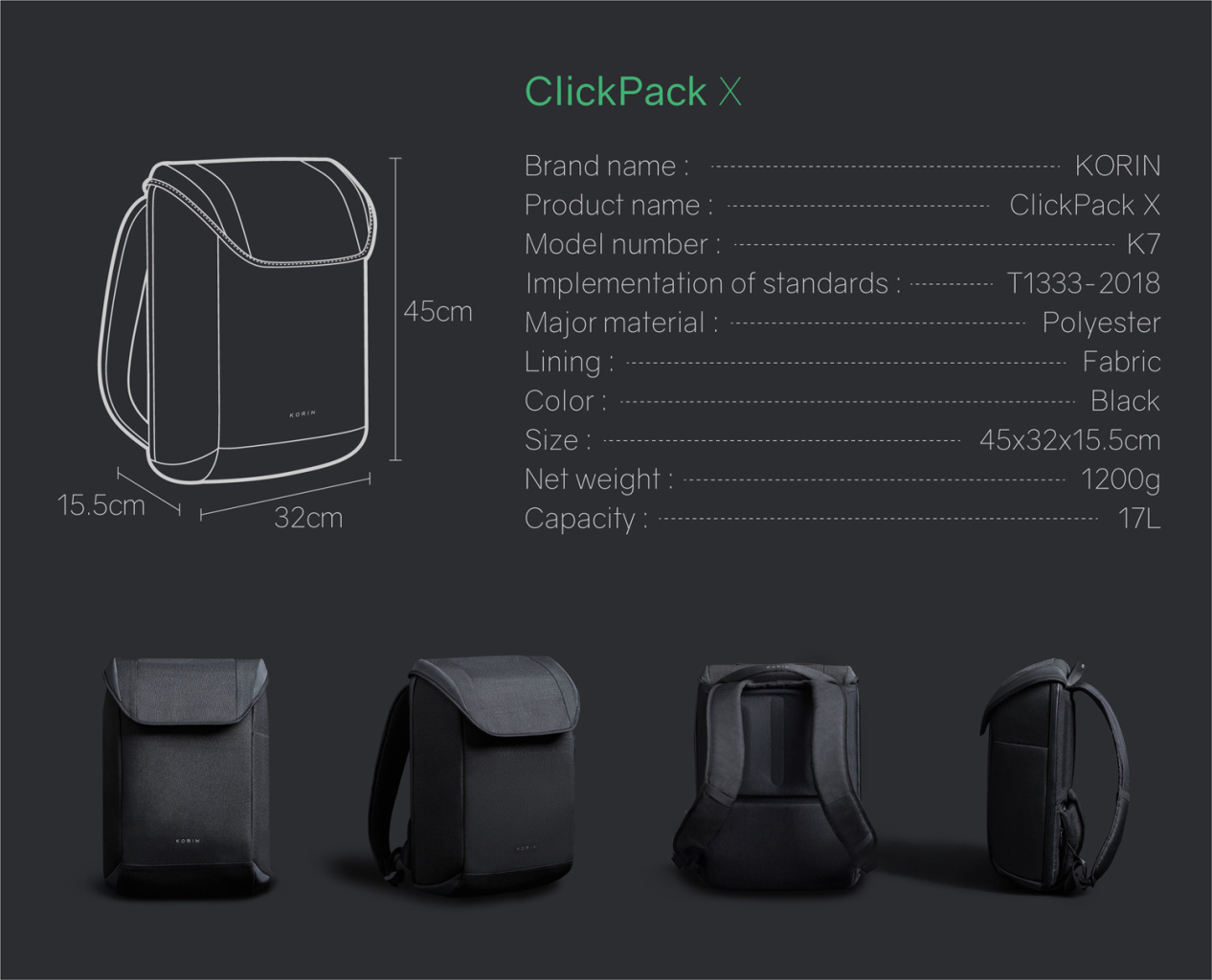 Рюкзак KORIN ClickPack X 45х32х15,5 см, с клапаном, черный