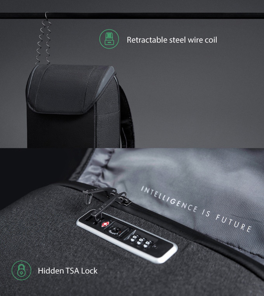 • Оснащен стальным тросом который можно зафиксировать бегунком молнии в кодовом замке
