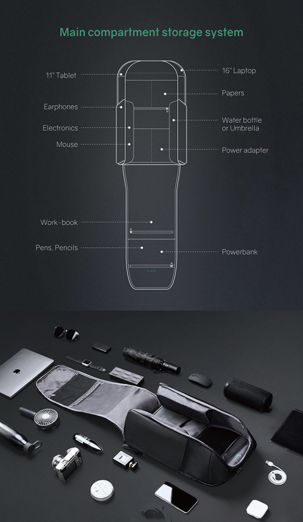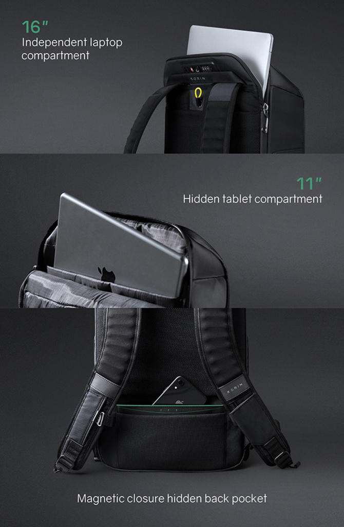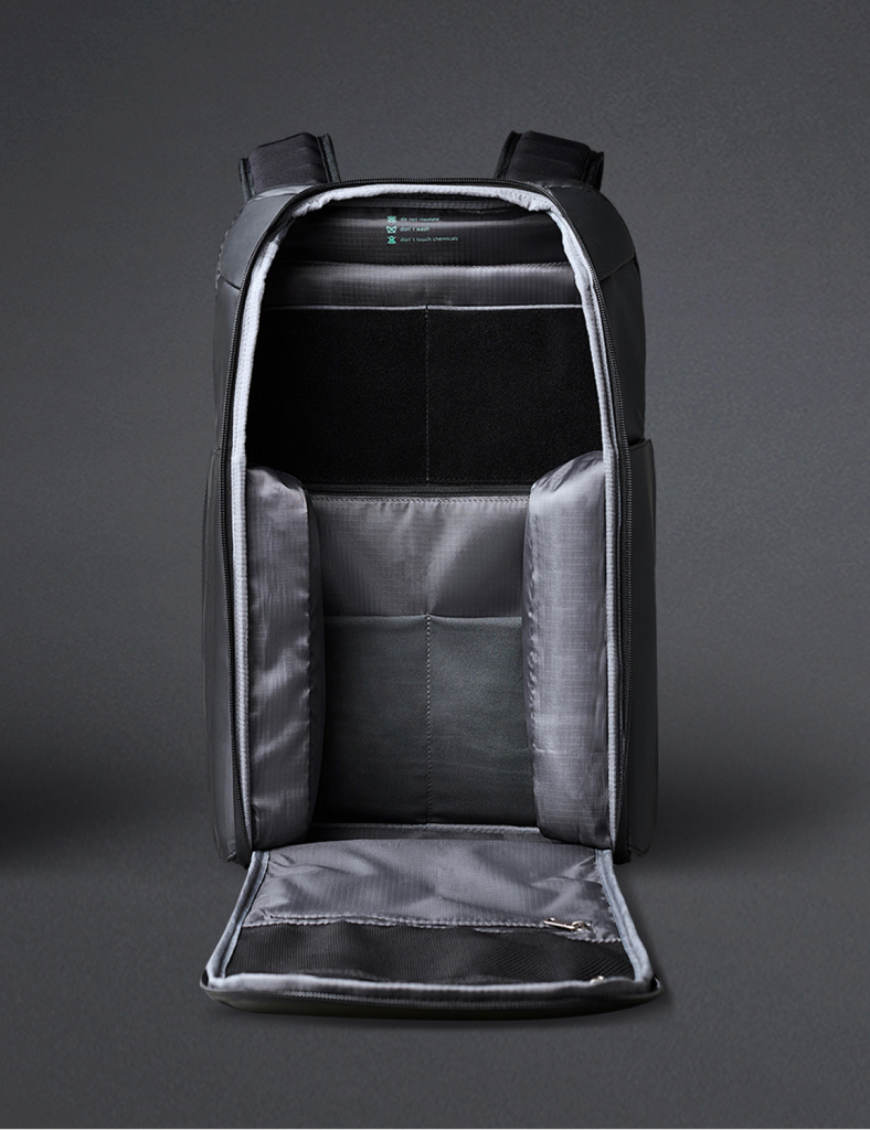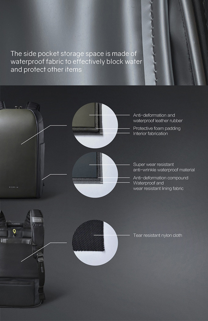 Рюкзак трехслойный: верхний слой - прочный водоотталкивающий полиэстер (искусственная кожа), слой вспененного материала и слой мягкой подкладочной ткани. Такая конструкция надежно защищает находящиеся внутри рюкзака предметы от воды, деформаций и других внешних. Детально продуманная организация отделений позволяет грамотно распределить вес. Самые тяжелые предметы располагаются ближе к спине. Благодаря плотным перегородкам ноутбук и планшет надежно фиксируются и не перемещаются при ходьбе.